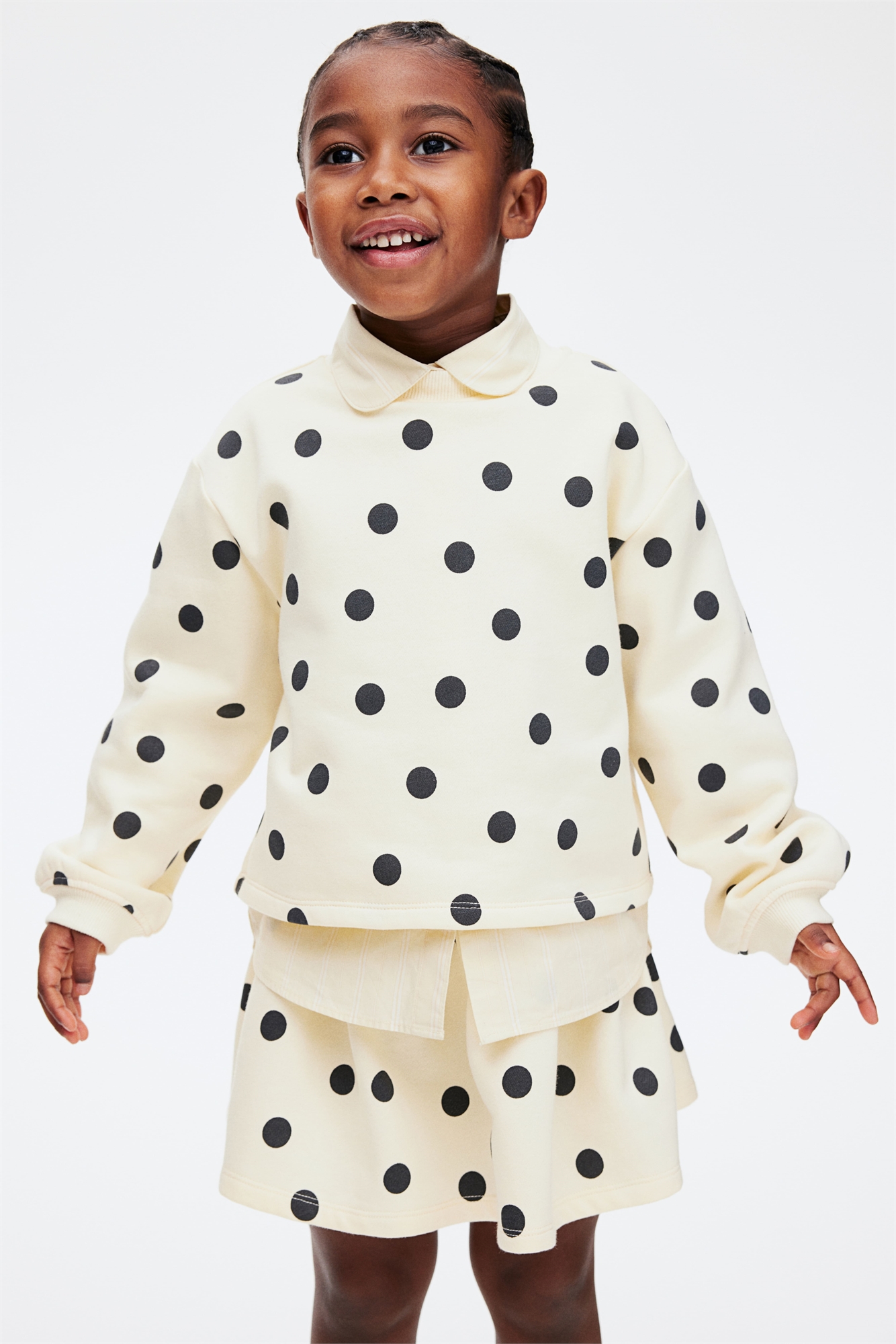 Комплект из топа и юбки из принтованной толстовки с мягким начесом внутри. Топ с круглым вырезом, отделанным ребрами, спущенными плечами и ребрами на манжетах. Объемная юбка со складками и широкой планкой на талии.