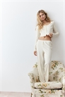 Пижама с коротким кардиганом и брюками из хлопкового трикотажа пуантелье. Кардиган с вырезом "совок", пуговицами спереди и длинными рукавами. Прямые брюки с закрытой резинкой на талии и фальшивой ширинкой с видимыми пуговицами.