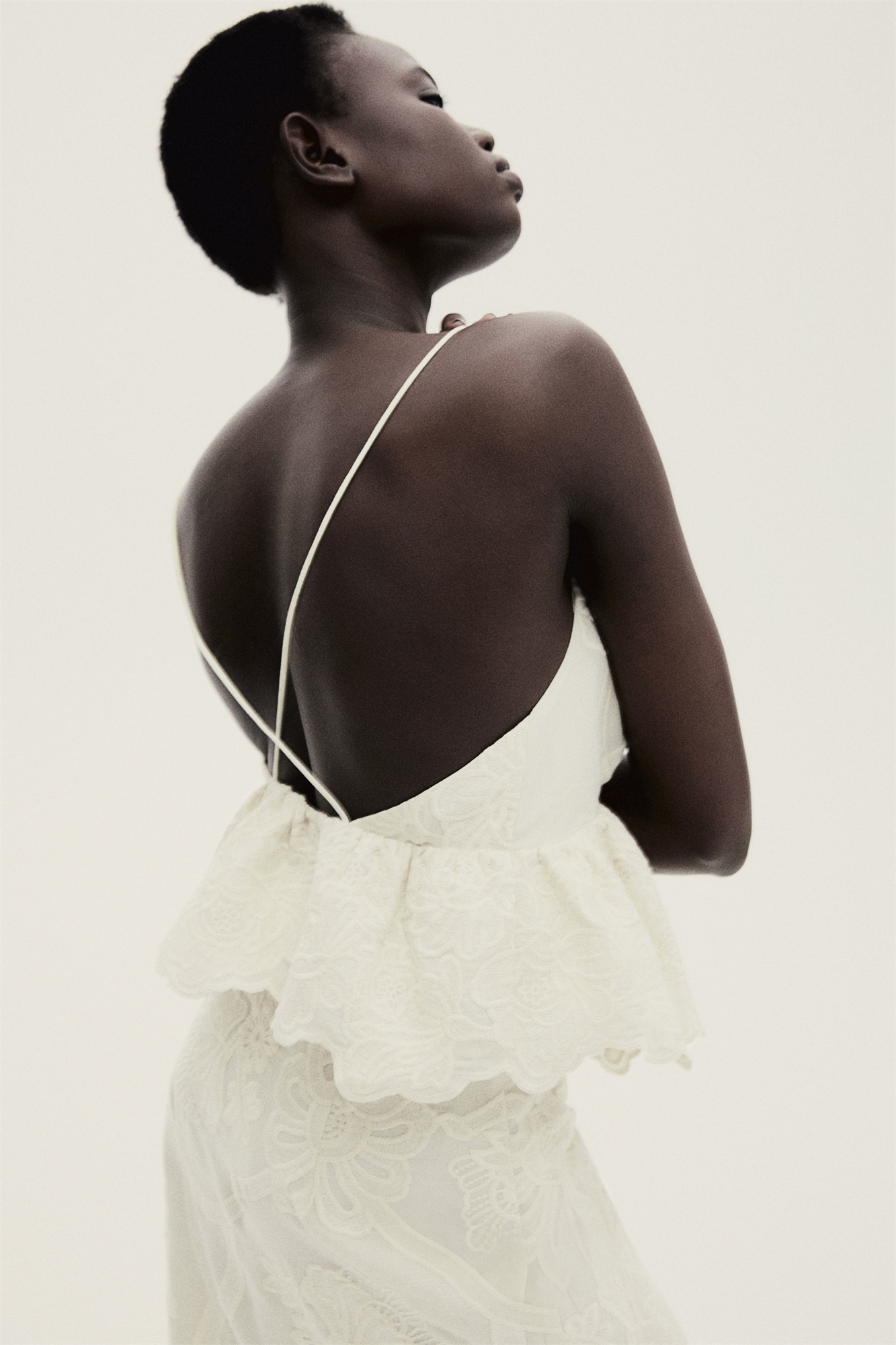 Короткий топ из тканого материала с вышивкой по всей поверхности. Глубокий V-образный вырез, открытая спина и бретели-спагетти, перекрещивающиеся сзади. Потайная застежка-молния с одной стороны, сборчатый шов под бюстом и пеплум с обшарпанным подолом. Подкладка из хлопковой вуали.
