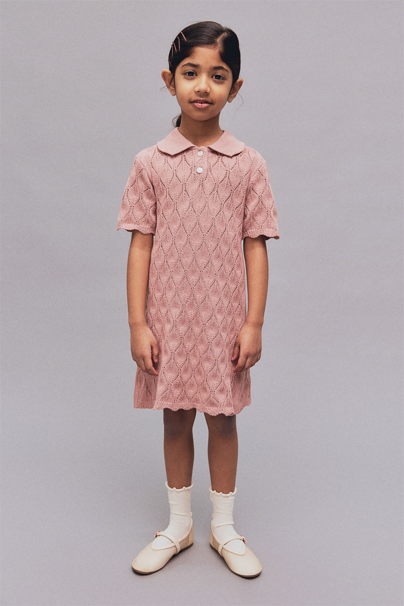 Платье с короткими рукавами из мягкого трикотажа пуантель с ребристым воротником, пуговицами в верхней части и ребристыми манжетами и подолом с гребешками.