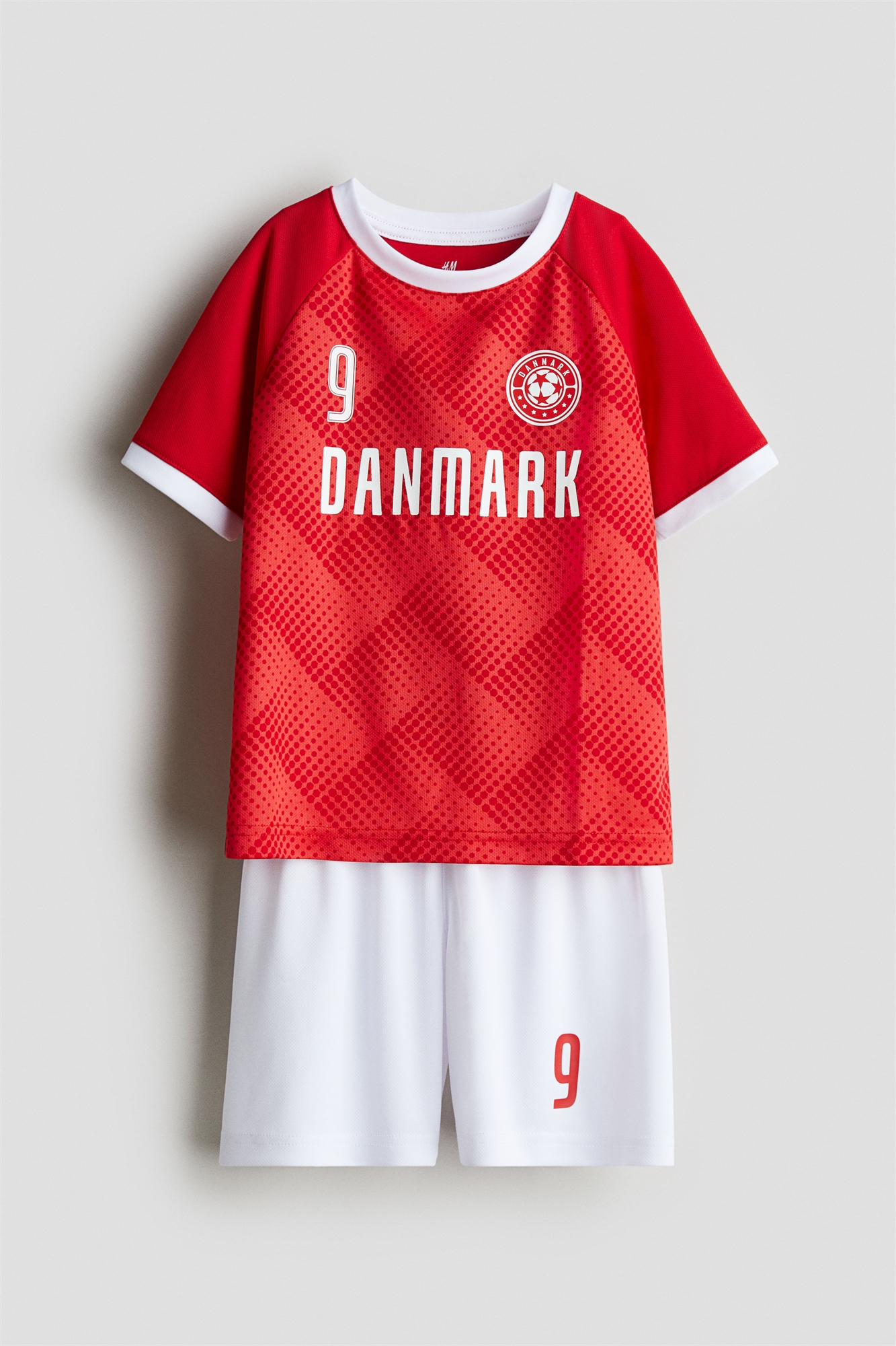 Футбольный комплект с принтом из мягкой сетчатой ткани: топ с короткими рукавами и шорты с эластичным поясом на завязках.