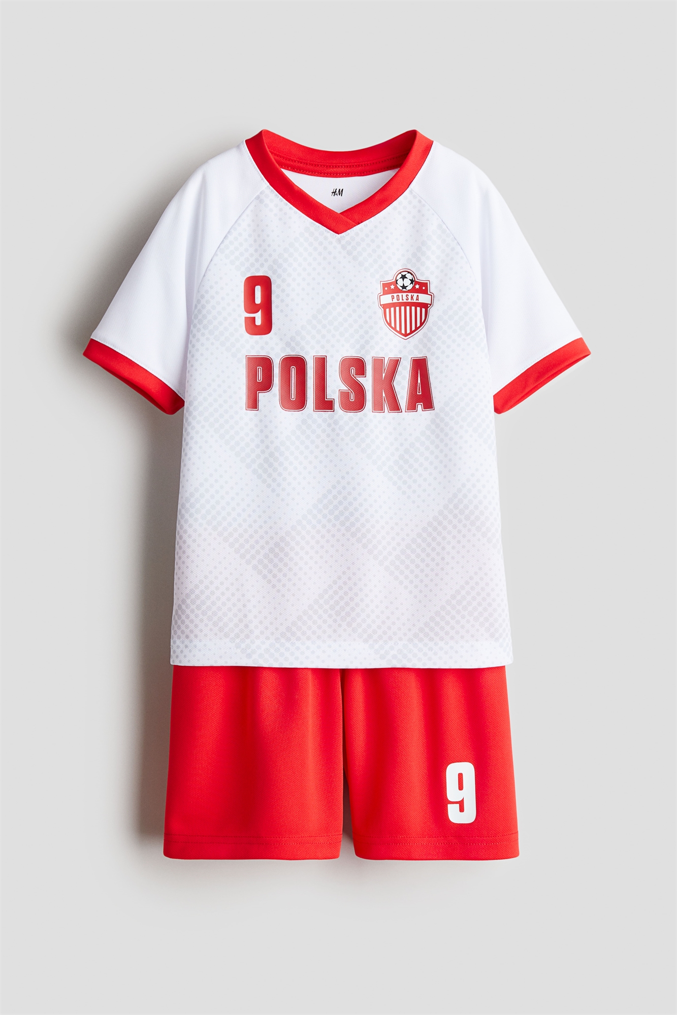 Футбольный комплект с принтом из мягкой сетчатой ткани: топ с короткими рукавами и шорты с эластичным поясом на завязках.
