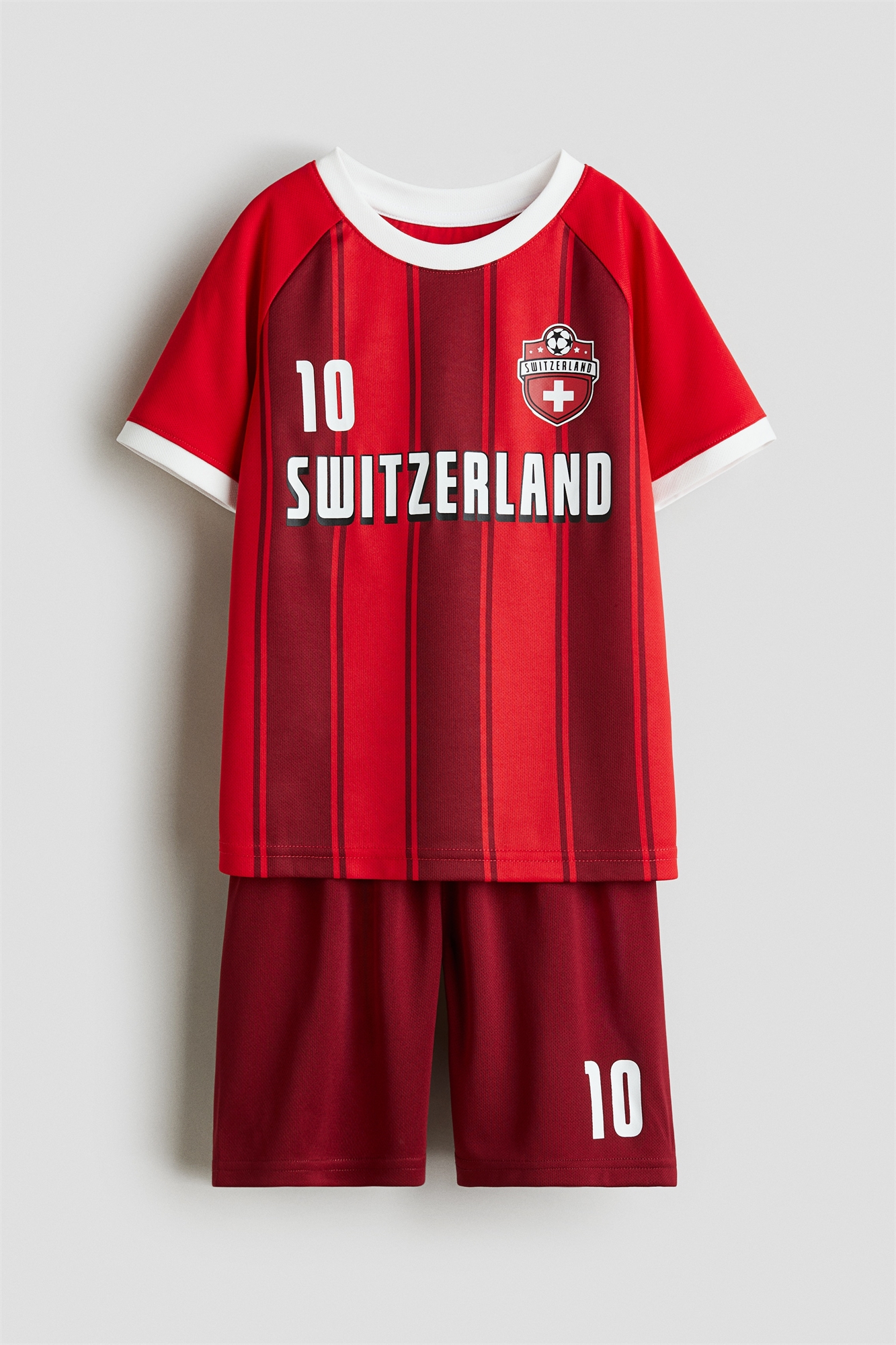 Футбольный комплект с принтом из мягкой сетчатой ткани: топ с короткими рукавами и шорты с эластичным поясом на завязках.
