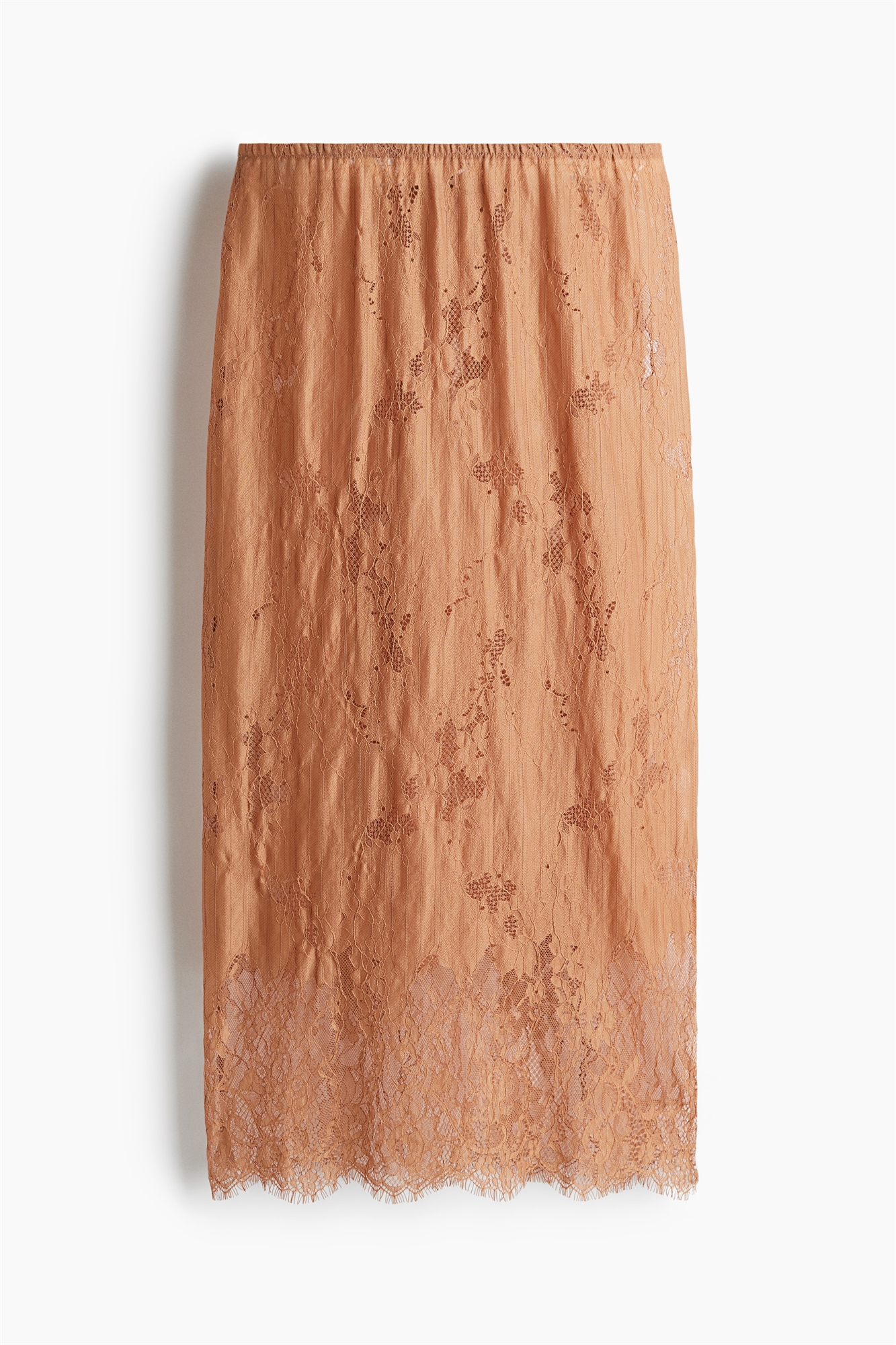 Кружевная юбка длиной до щиколоток с высокой талией, узким эластичным поясом и обтрепанным подолом. Без подкладки.