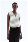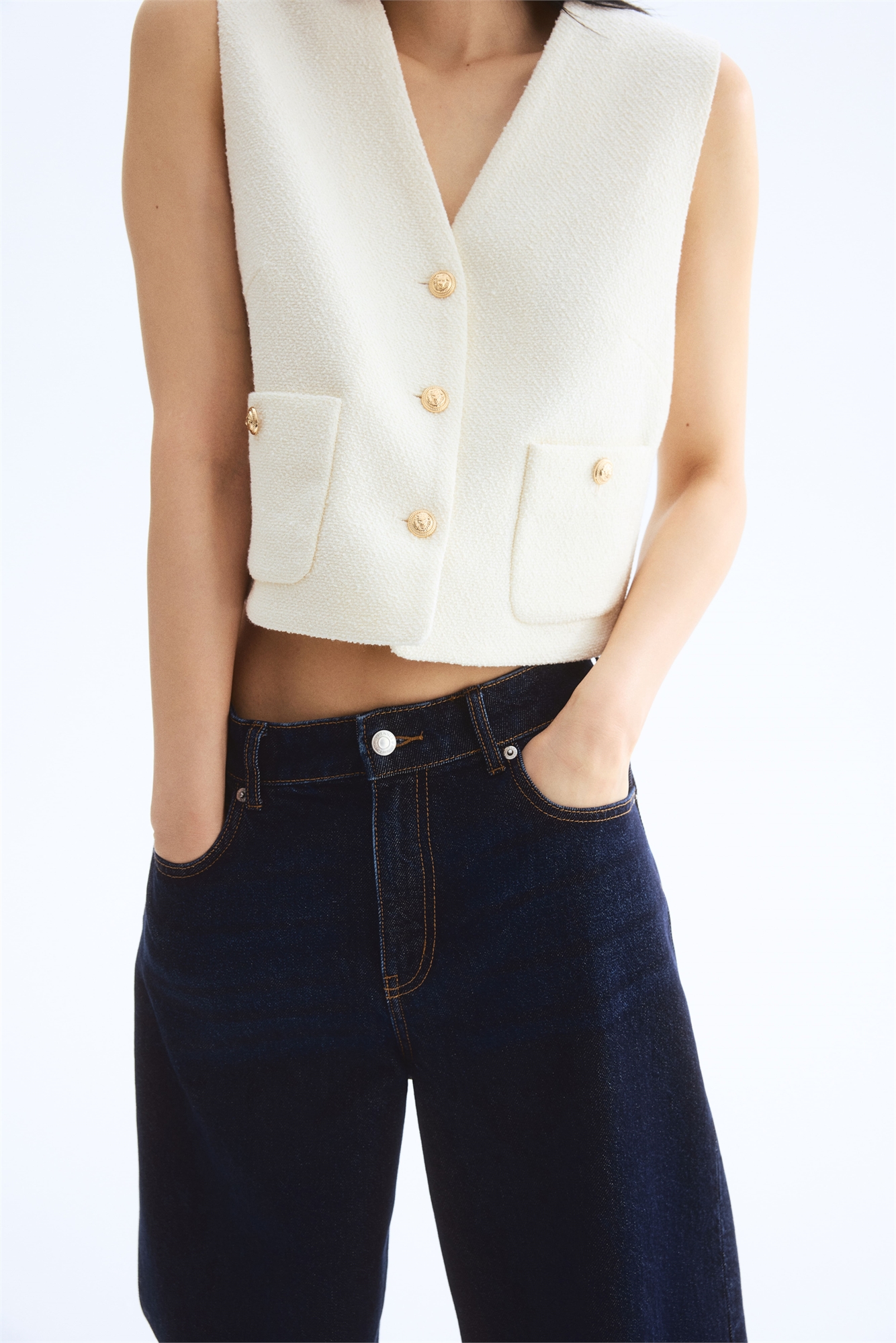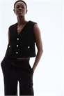 Приталенный жилет из ткани букле с V-образным вырезом и пуговицами спереди. Нагрудные вытачки, накладные передние карманы на пуговице и прямой подол с мягко изогнутыми боковыми вентиляционными отверстиями. На подкладке.