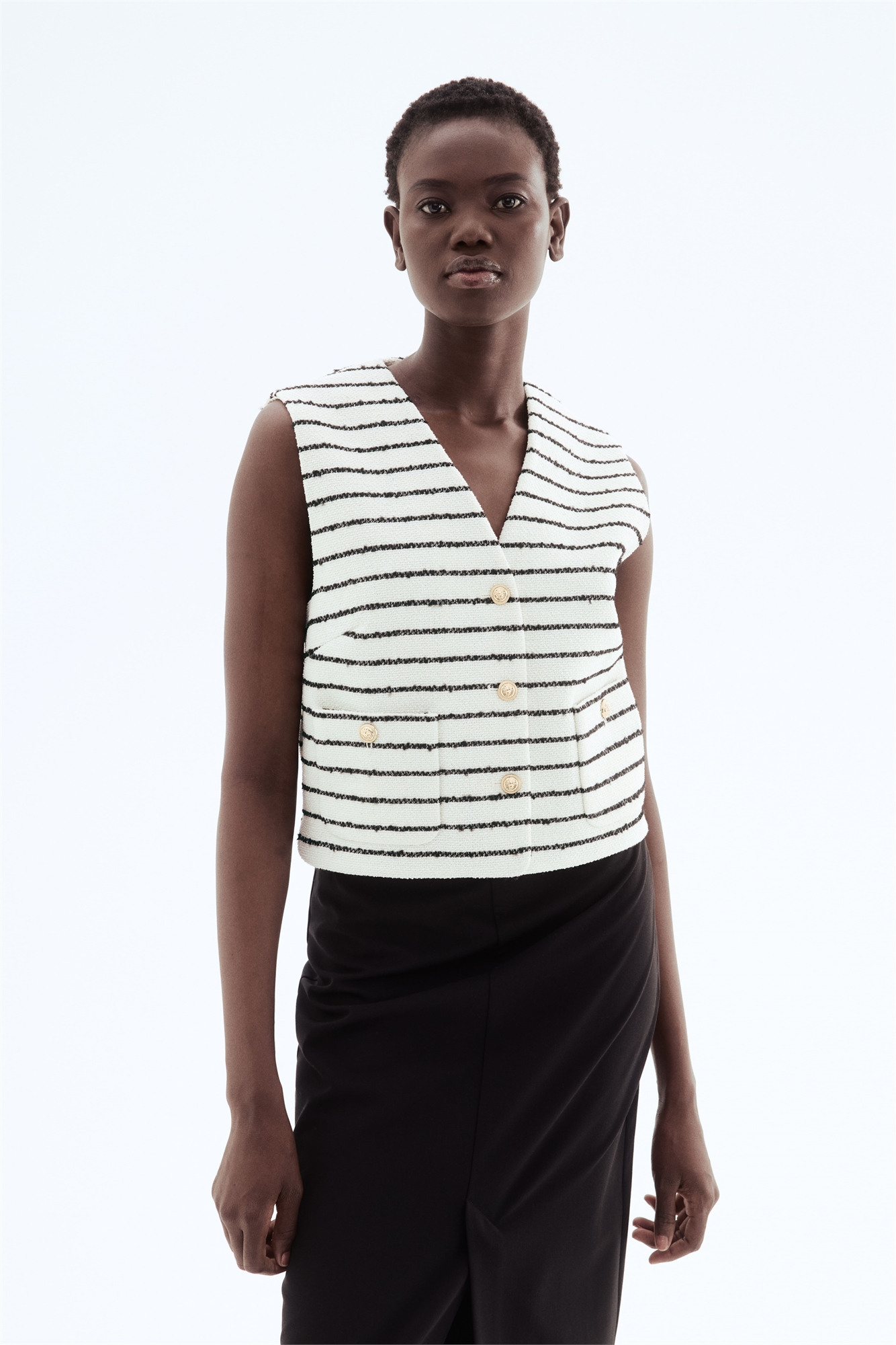 Приталенный жилет из ткани букле с V-образным вырезом и пуговицами спереди. Нагрудные вытачки, накладные передние карманы на пуговице и прямой подол с мягко изогнутыми боковыми вентиляционными отверстиями. На подкладке.