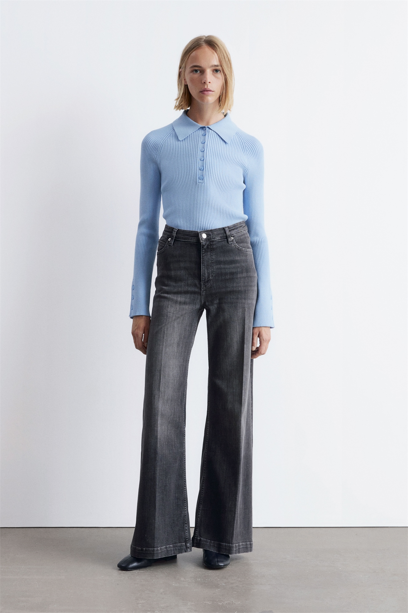 Джинсы с высокой талией, длинными широкими штанинами и заутюженными складками. • Regular fit • Ширинка на молнии с застежкой на пуговицу • Суперстрейч Длина джинсов: 80,5 см / 31,7" (EU 38 / UK 10 / US 6)