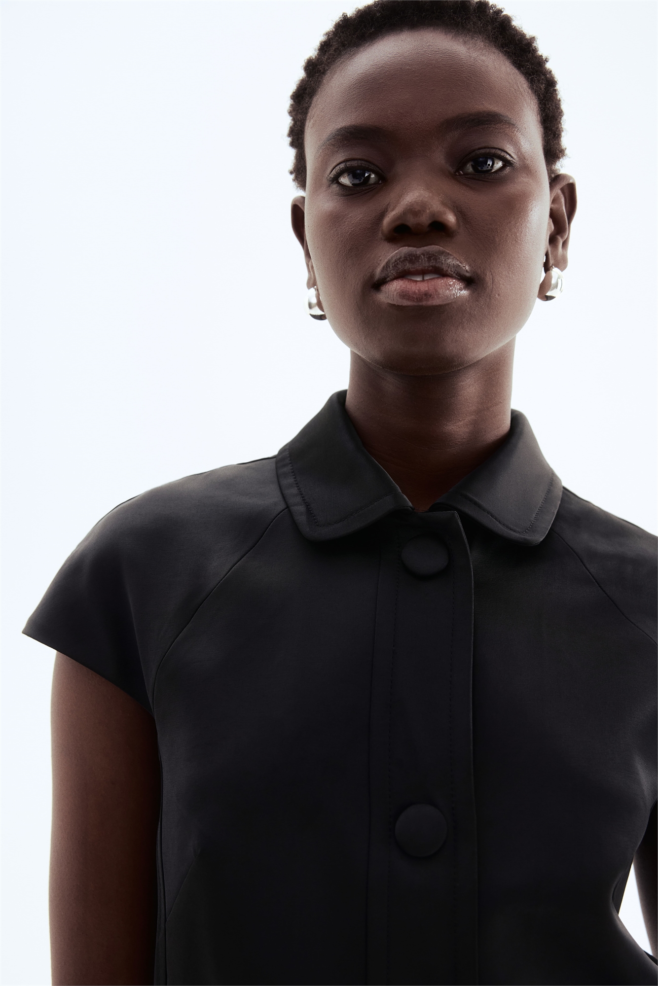 Короткая приталенная куртка из тканого материала с воротником, застежкой на кнопки спереди, рукавами реглан и диагональными передними карманами. На подкладке.