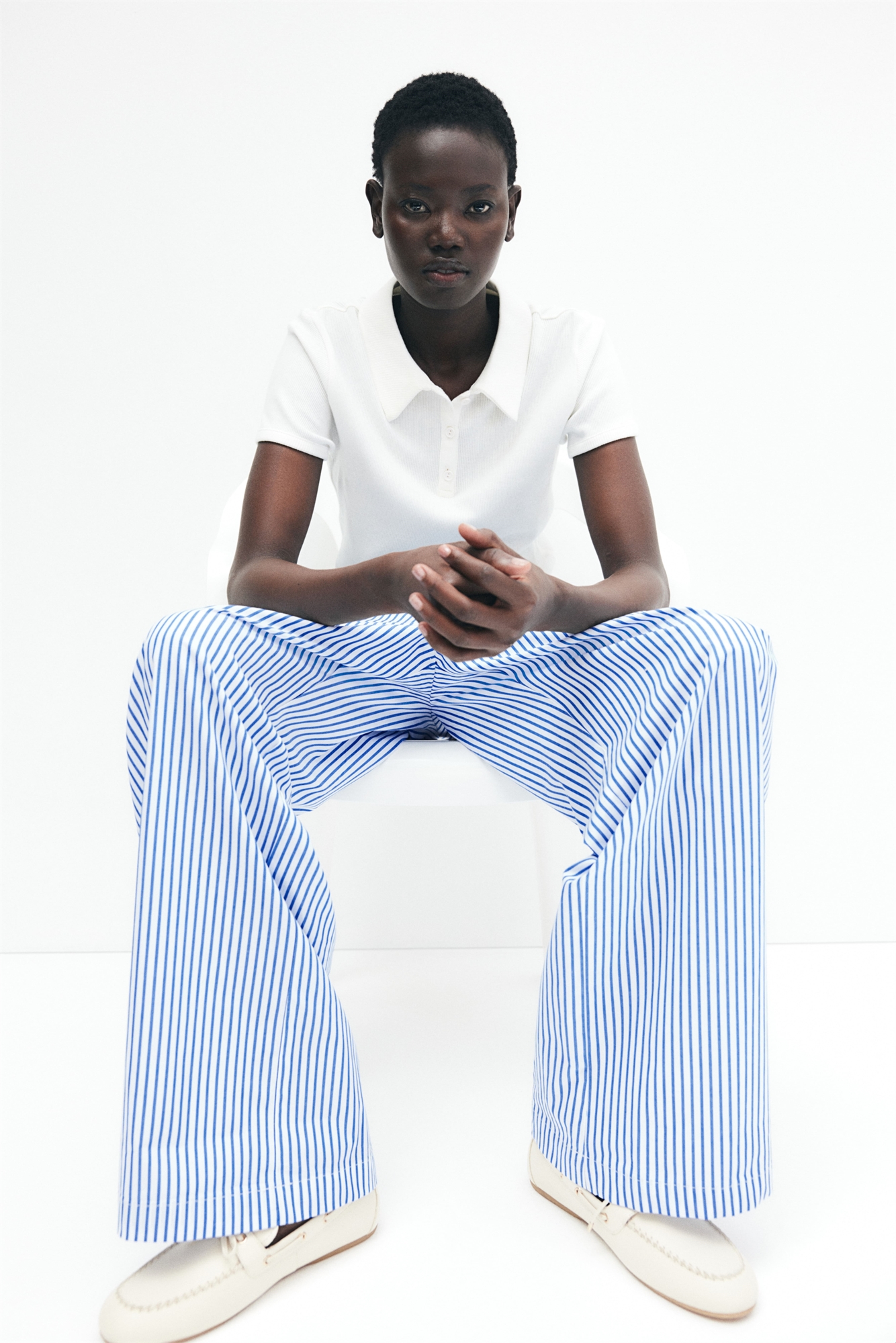 Свободные брюки из хлопкового полотна с высокой талией, эластичной планкой и узким шнурком. Небрежные боковые карманы и широкие штанины.