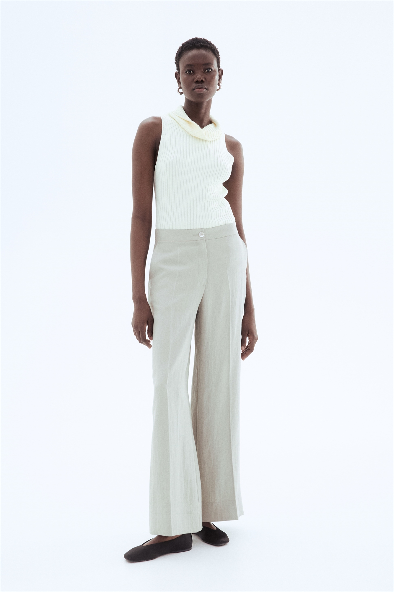 Свободные приталенные брюки из саржи с высокой талией, ширинкой на молнии и пуговице, диагональными боковыми и задними карманами. Широкие ноги со складками спереди и сзади.
