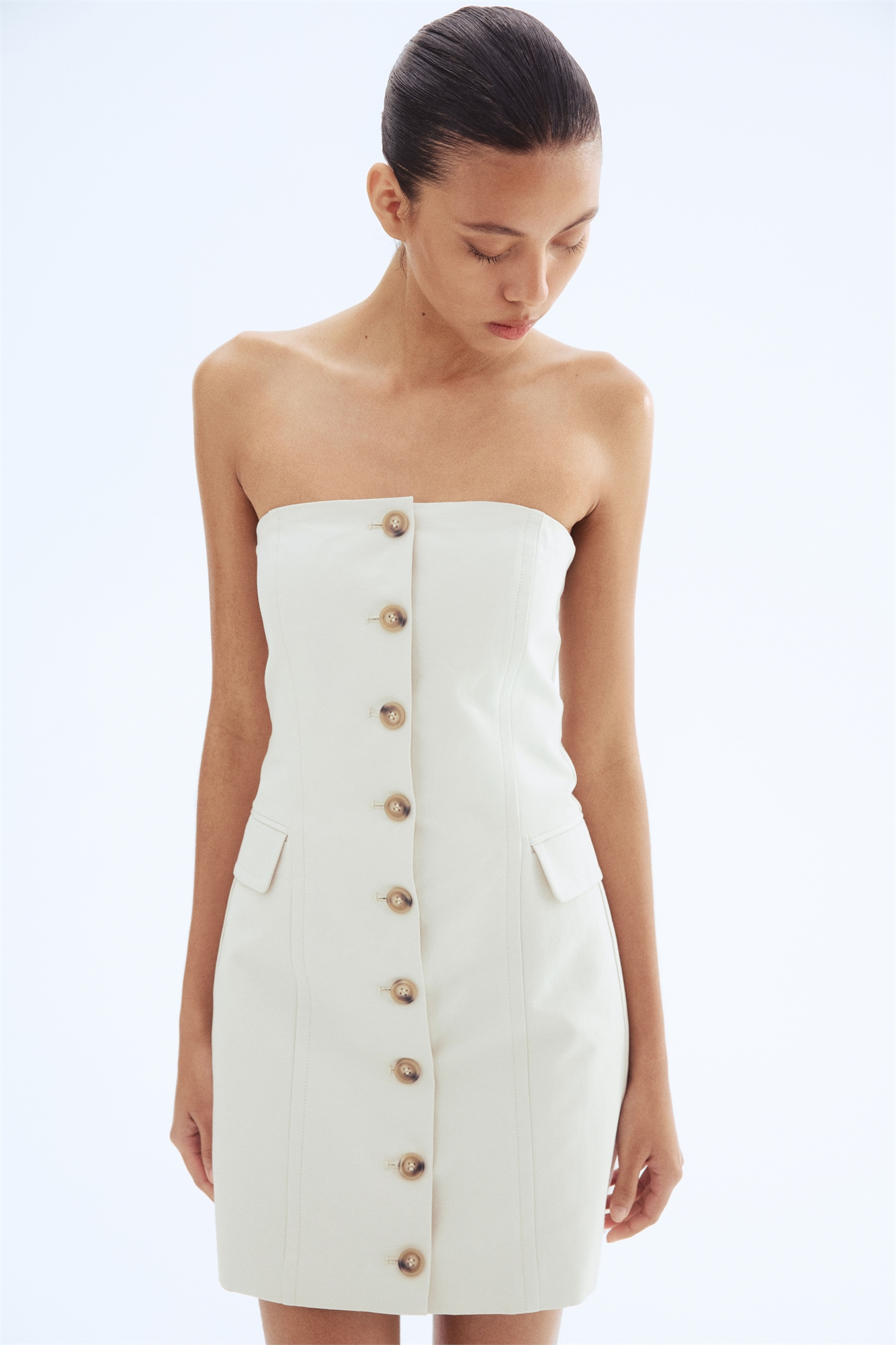 Короткое платье-бандо из тканого материала из смеси хлопка. Облегающий крой со скрытой силиконовой отделкой в верхней части, боны по бокам и скрытая эластичная резинка сзади. Формообразующие швы, пуговицы спереди и втачные передние карманы с клапаном. На подкладке.