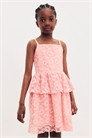 Платье из мягкого кружева из смеси вискозы. Квадратный вырез, узкие бретели и пуговицы по спинке. Сборчатый шов на талии с декоративным воланом. На подкладке.