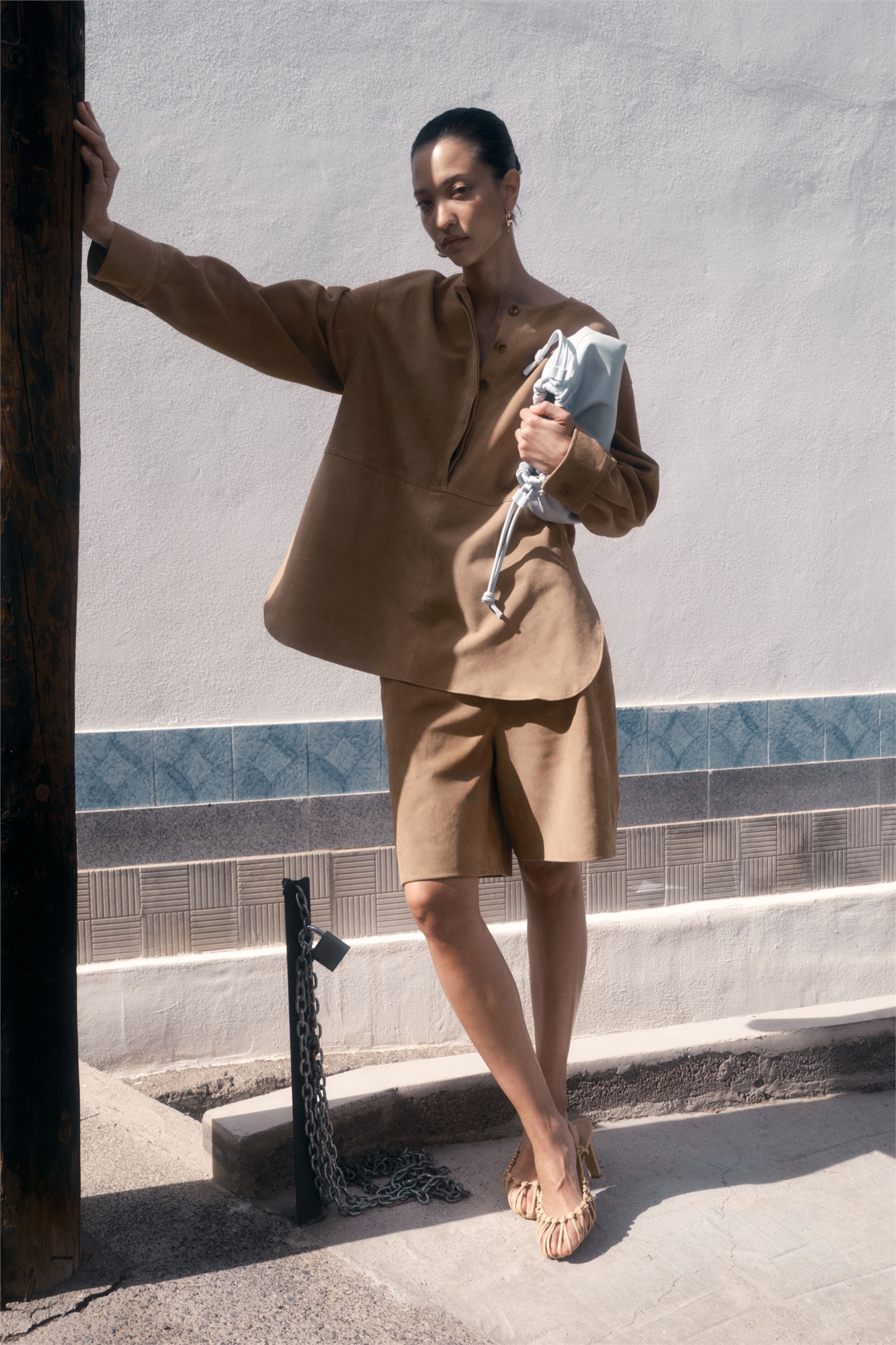 Свободная блузка из мягкой замши с видимыми швами спереди и сзади. Круглый вырез, потайная застежка на пуговицах спереди, спущенные плечи и длинные рукава с манжетами на пуговицах. Аккуратный закругленный подол с высоким разрезом с каждой стороны.