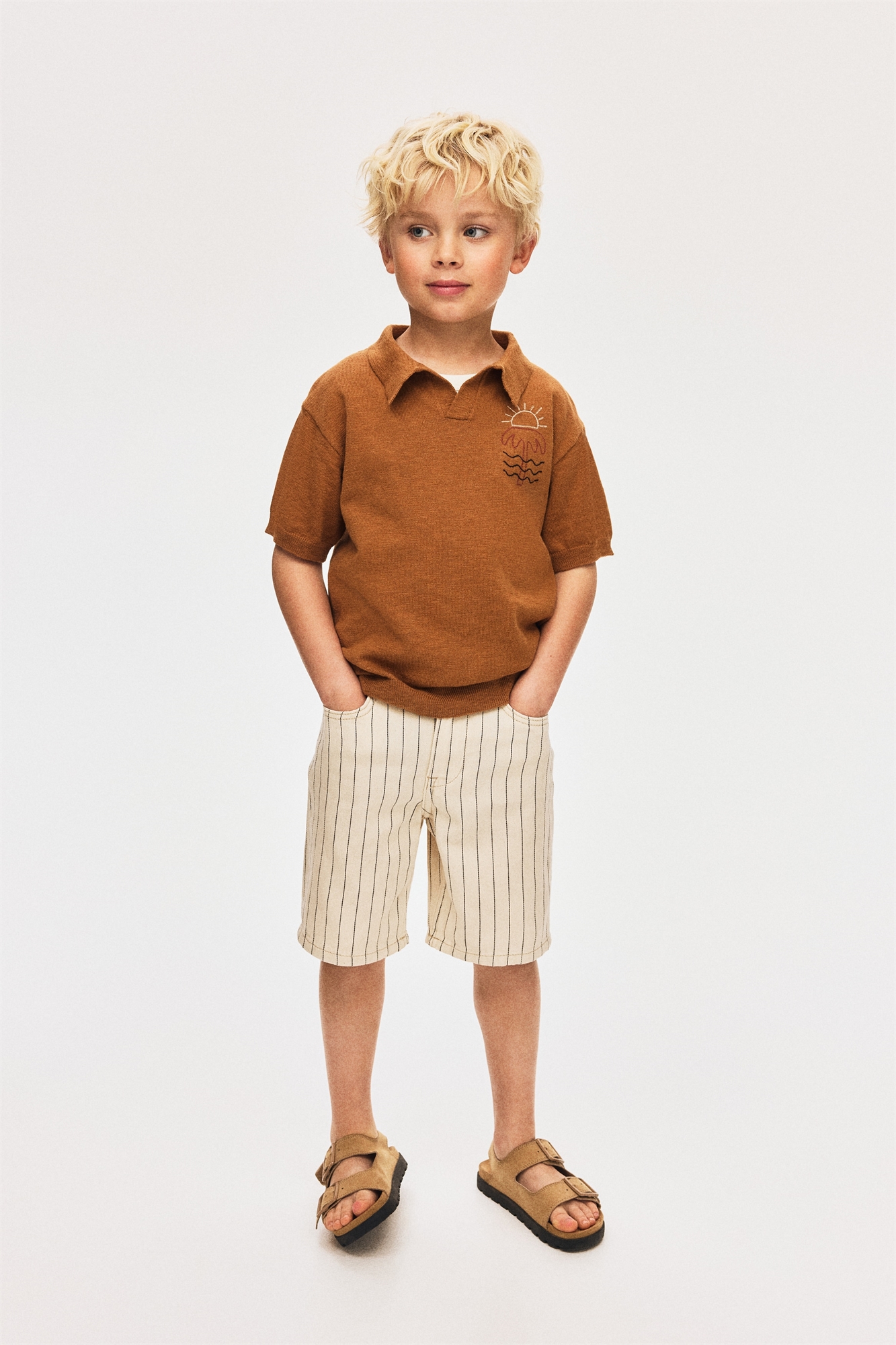 Рубашка-поло с короткими рукавами из мягкого фактурного трикотажа из смеси хлопка. V-образный вырез, спущенные плечи и тонкая трикотажная отделка на манжетах и подоле.