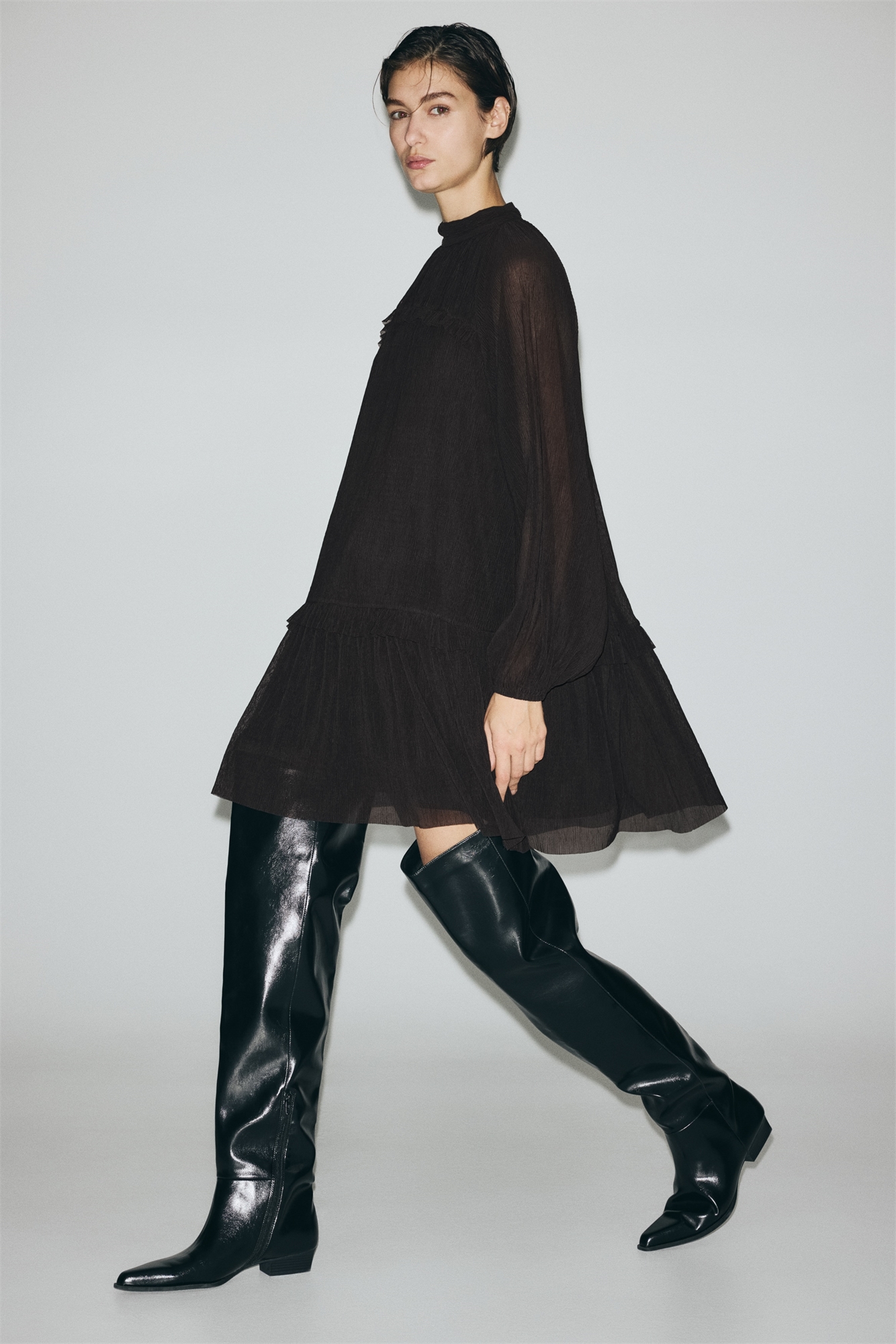 Короткое платье из легкого трикотажа плиссе с небольшим воротником-стойкой с V-образной проймой и закрытыми пуговицами сзади. Длинные рукава-баллоны реглан с узкими эластичными манжетами. Отделка жабо на бюсте и по подолу. Частично на подкладке.