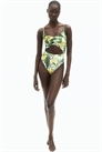 Полностью на подкладке, купальник с V-образным вырезом, регулируемыми бретелями и чашечками со съемными вкладышами, придающими форму бюсту и обеспечивающими хорошую поддержку. Сборчатый шов по центру бюста и вырез на талии спереди. Ноги с высоким разрезом и вырезом сзади.