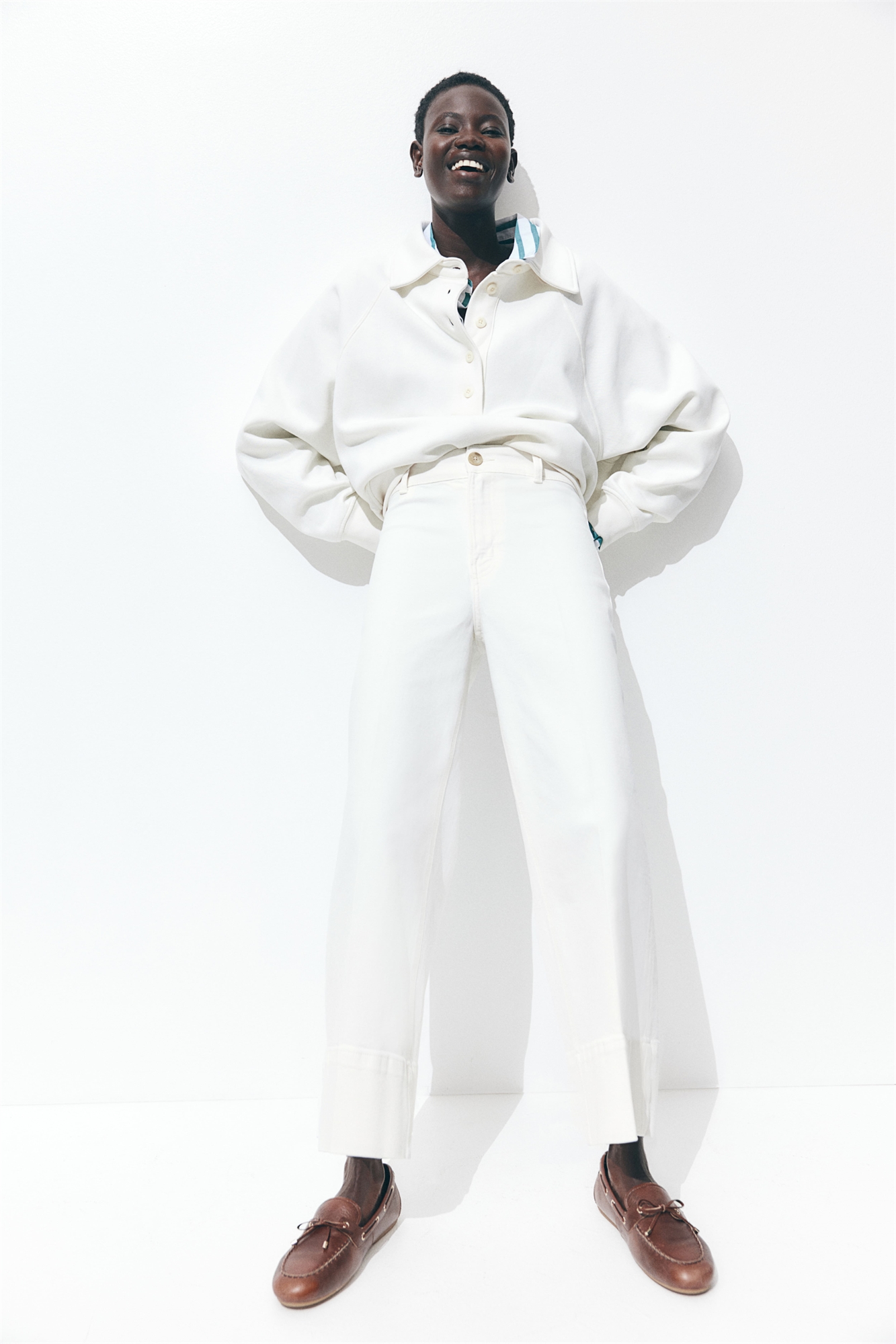 Джинсы из хлопкового денима с легким стретчем для комфорта. Широкие штанины с обычной посадкой от талии до бедра и широким разрезом от бедра до подола. Высокая талия с ширинкой на молнии и пуговице. Накладные задние карманы. Обрезанная длина, призванная заходить на косточку над лодыжкой и демонстрировать щиколотку. Джинсы с широкими штанинами - незаменимая вещь в гардеробе.
