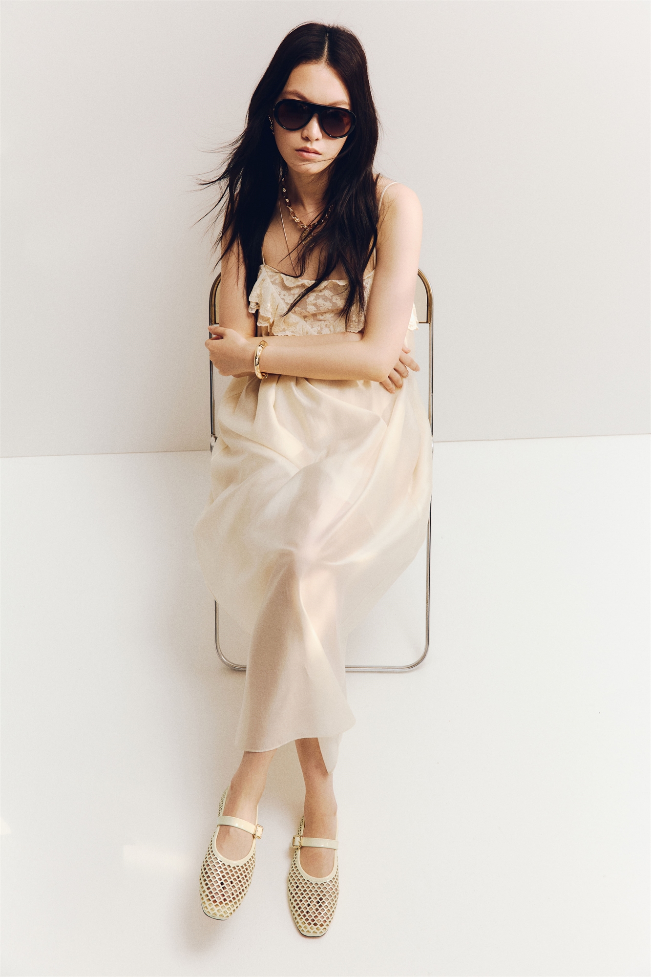Перфорированные балетки в стиле Мэри Джейн из ткани с покрытием. Закругленные мыски, регулируемый ремешок на ноге с металлической пряжкой и петлей сзади.