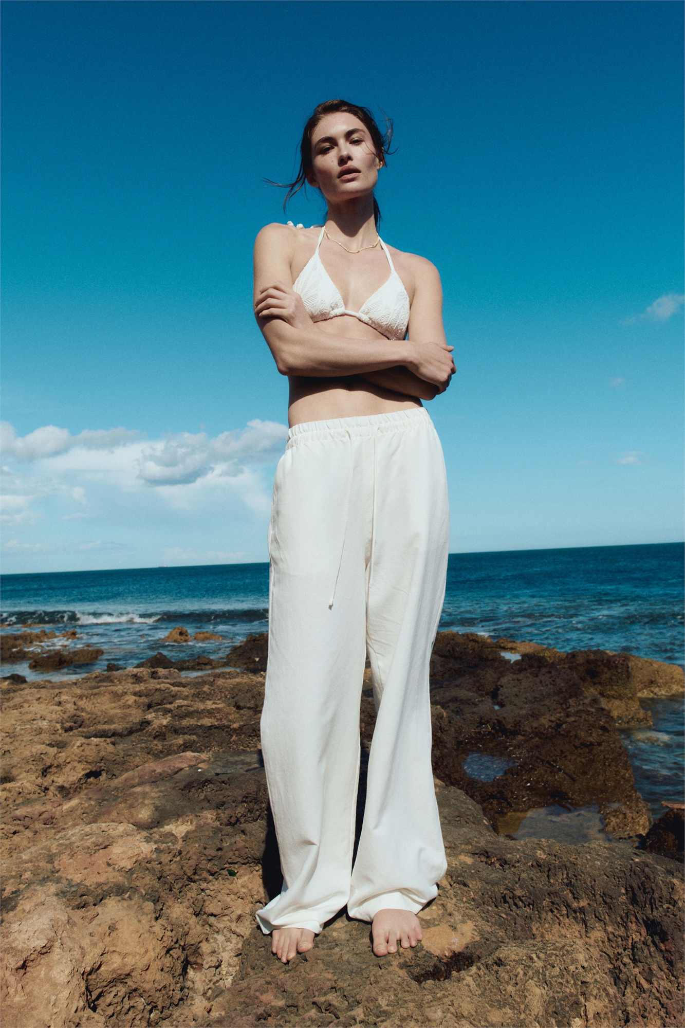 Бикини-треугольник на подкладке с вязаным рисунком. Чашечки со съемными вставками, придающими форму бюсту и обеспечивающими хорошую поддержку. Завязки сзади и на шее.