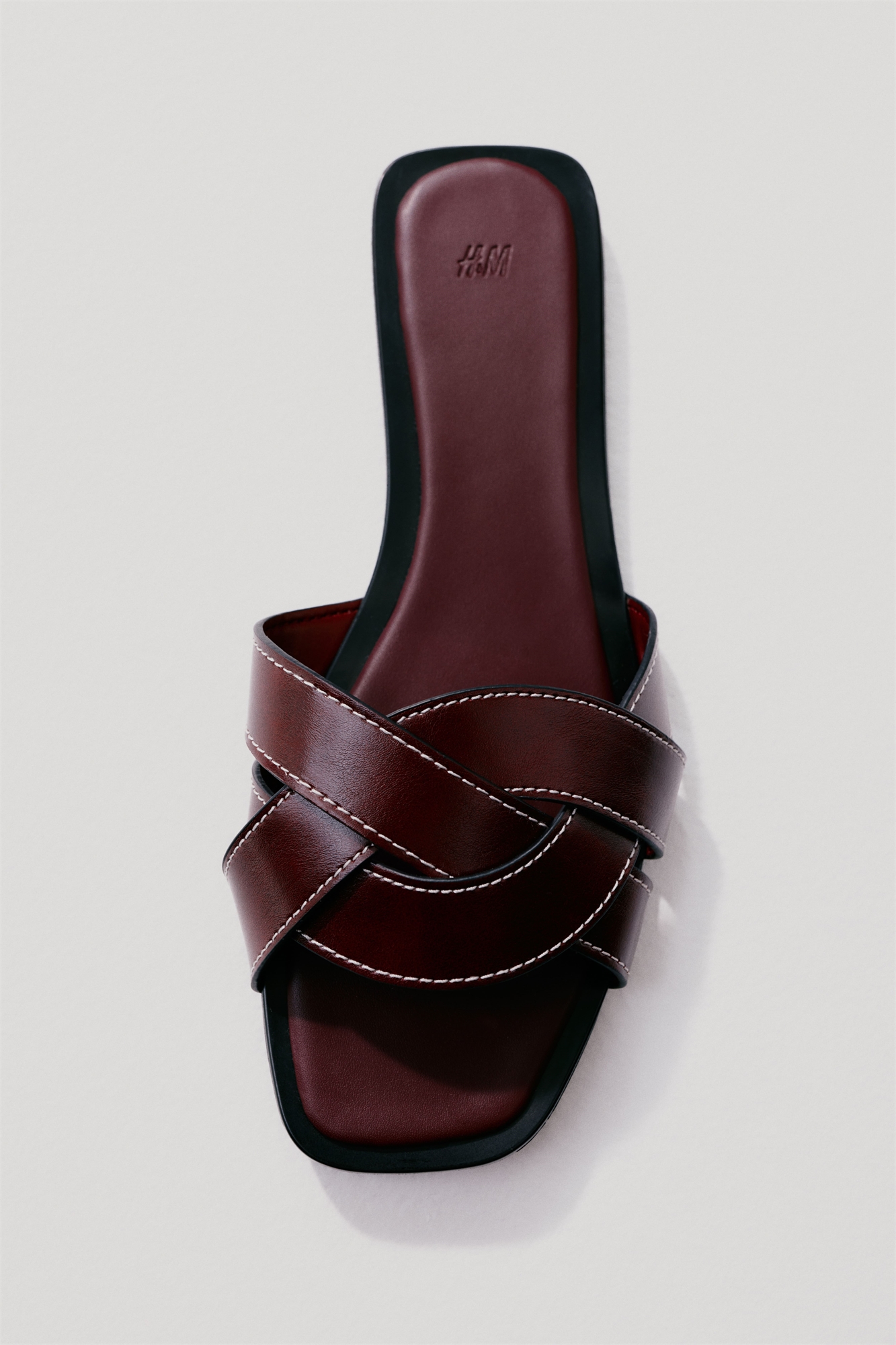 Сандалии с квадратным носком и широким плетеным ремешком. Каблук 1 см.