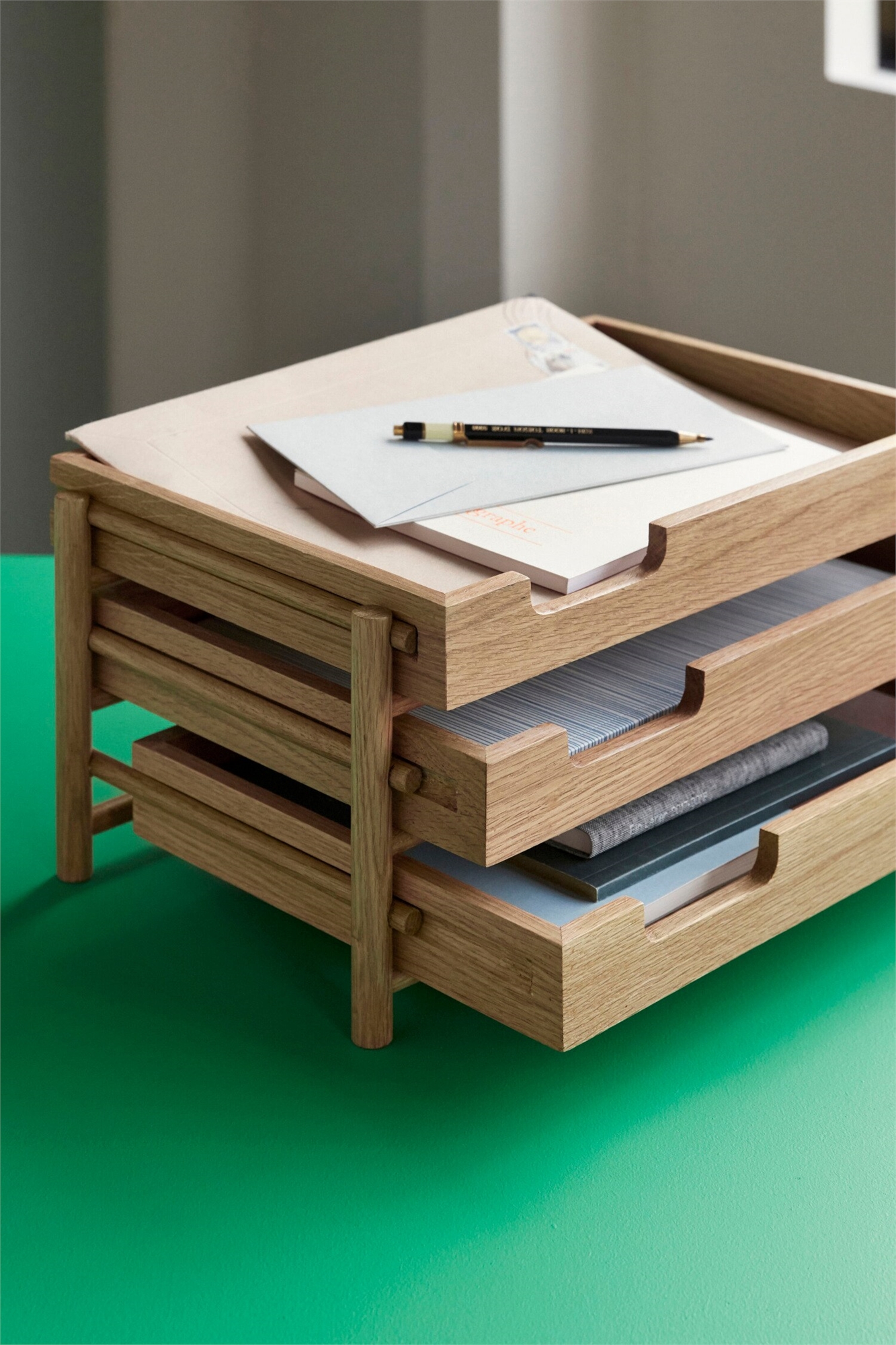 Лоток для писем изготовлен из дуба и сертифицирован FSC®. Стильное и практичное дополнение к вашему офису. В лотке есть три отделения для хранения личных вещей и рабочих материалов. Размер: 38x24xh17 см