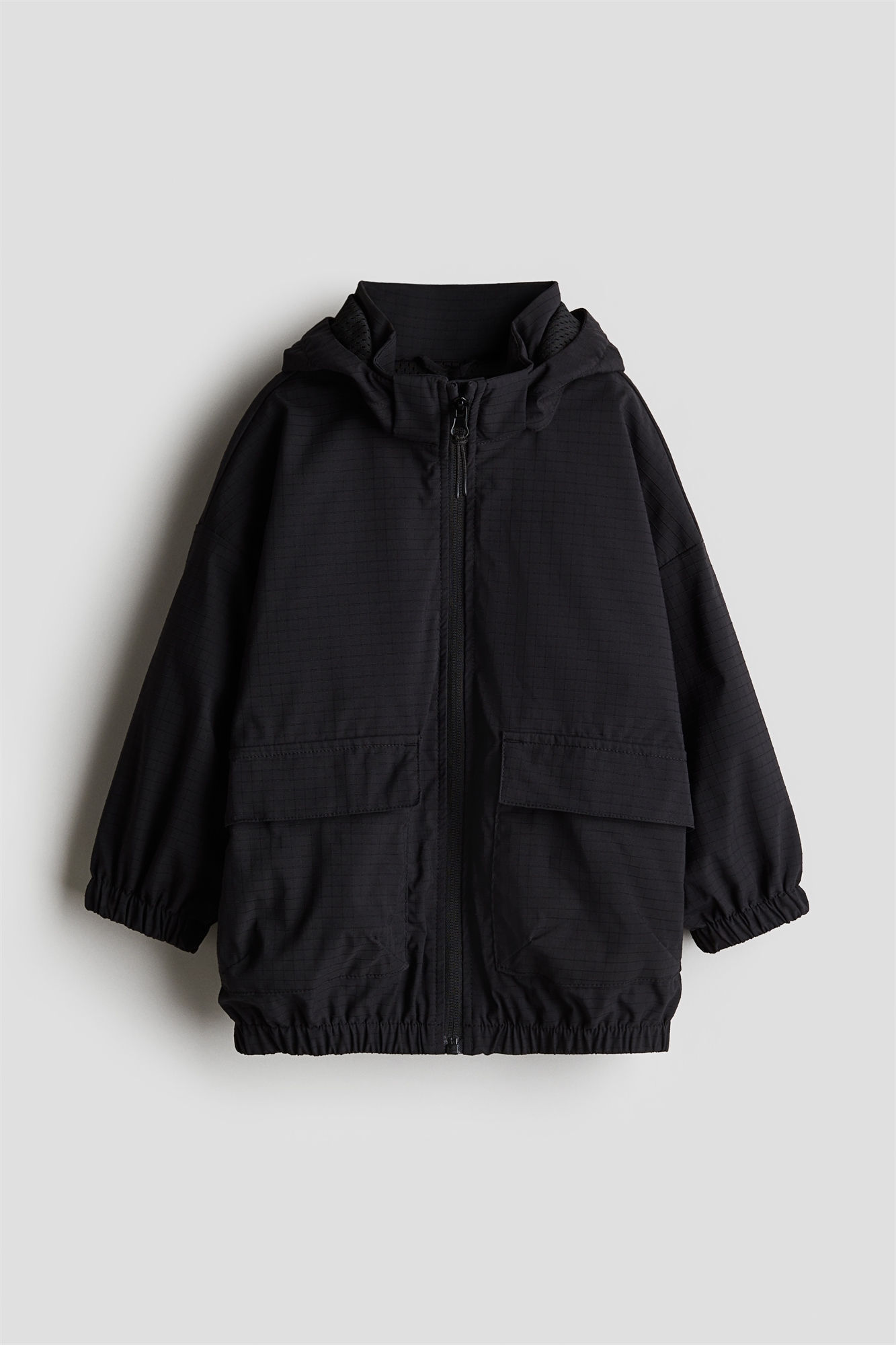 Свободная ветровка из тканого материала с отстегивающимся капюшоном. Воротник-стойка, застежка-молния спереди, защита подбородка от натирания и спущенные плечи. Накладные передние карманы с застежкой на крючок и петлю, манжеты и подол с эластичной отделкой. На сетчатой подкладке.
