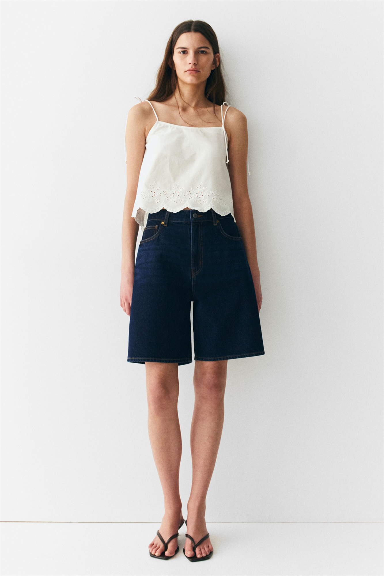 Шорты длиной до колена с 5 карманами из хлопкового денима с высокой талией, застежкой на молнию и пуговицу.