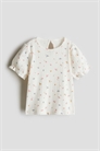 Топ из мягкого фактурного джерси. Круглый вырез, прорезь для ключа с пуговицей сзади, короткие пышные рукава с узкой резинкой и оборкой на манжетах.