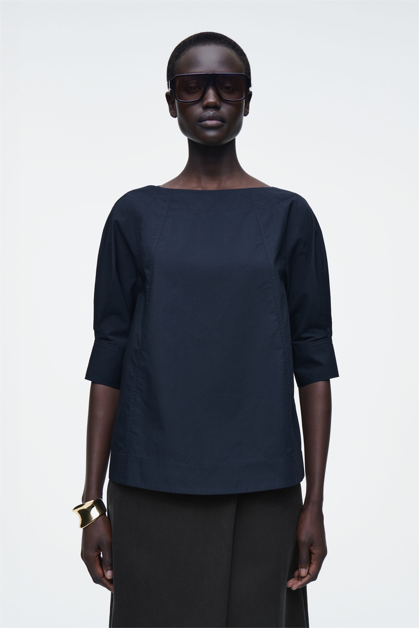 Эта изысканная блузка объемного кроя сшита из качественного хлопка приглушенного белого оттенка. Она имеет вырез-лодочку, пышные рукава реглан и изогнутый подол А-линии. Regular fitButtoned cuffs Shell: 100% Cotton. Без учета отделки / Машинная стирка Длина по спинке для размера EU 36 составляет 57,5 см / Модель носит размер EU 36