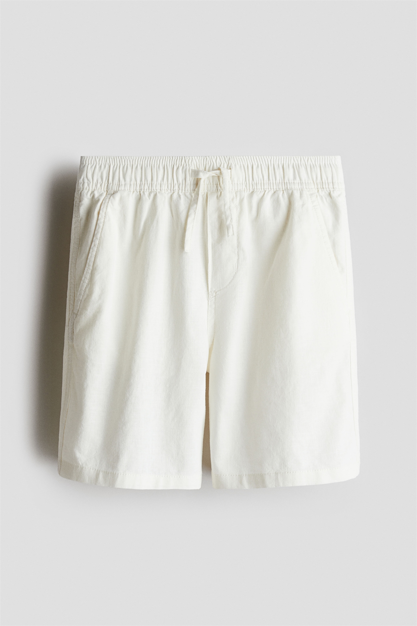 Шорты из хлопка и льна с эластичным поясом, затягивающимся шнурком, фальшивой ширинкой, диагональными передними карманами и открытым задним карманом.