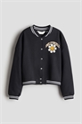 Куртка из толстовочной ткани с мягкой начесом внутри и принтом спереди и сзади. Небольшой воротник-стойка с ребристой отделкой, кнопки спереди, ребристые манжеты и подол.