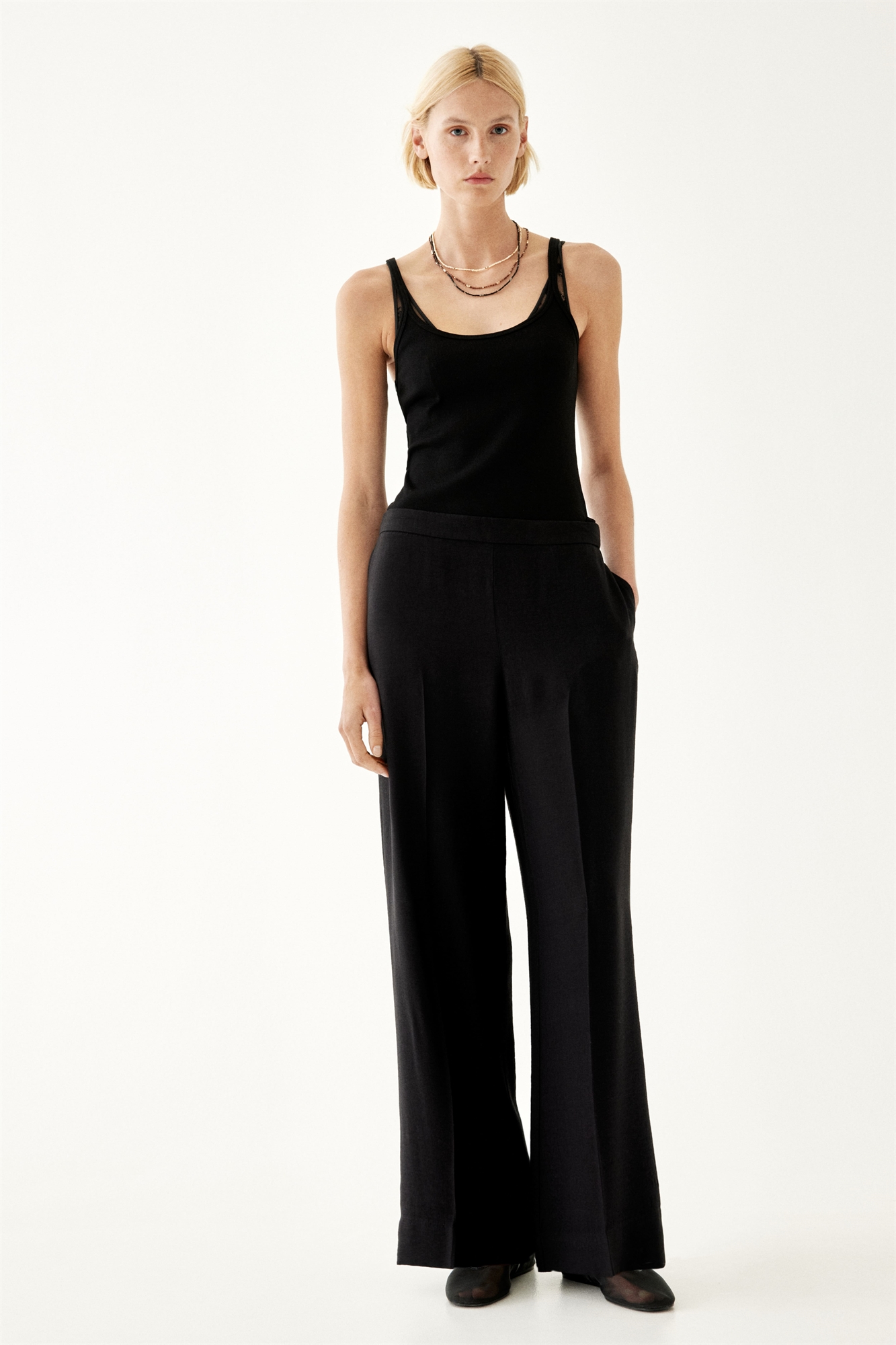 Свободные брюки из доби с высокой талией, эластичной резинкой сзади и потайной застежкой на молнию и крючок с ушком с одной стороны. Небрежные боковые карманы и широкие ноги со складками спереди и сзади.