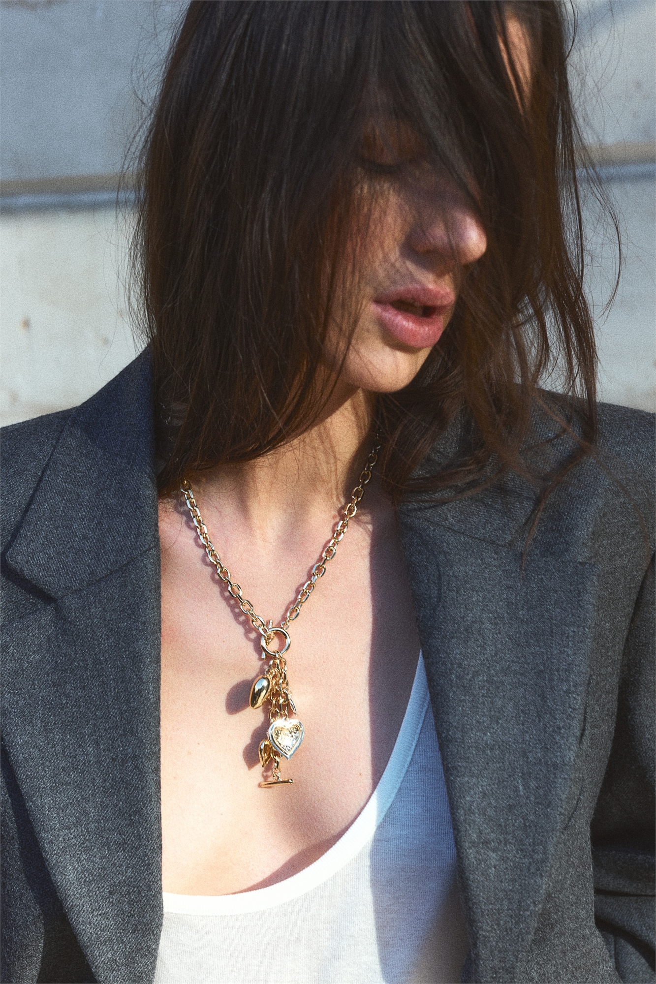 Веревочное ожерелье с несколькими подвесками разного дизайна. Тумблерная застежка спереди.