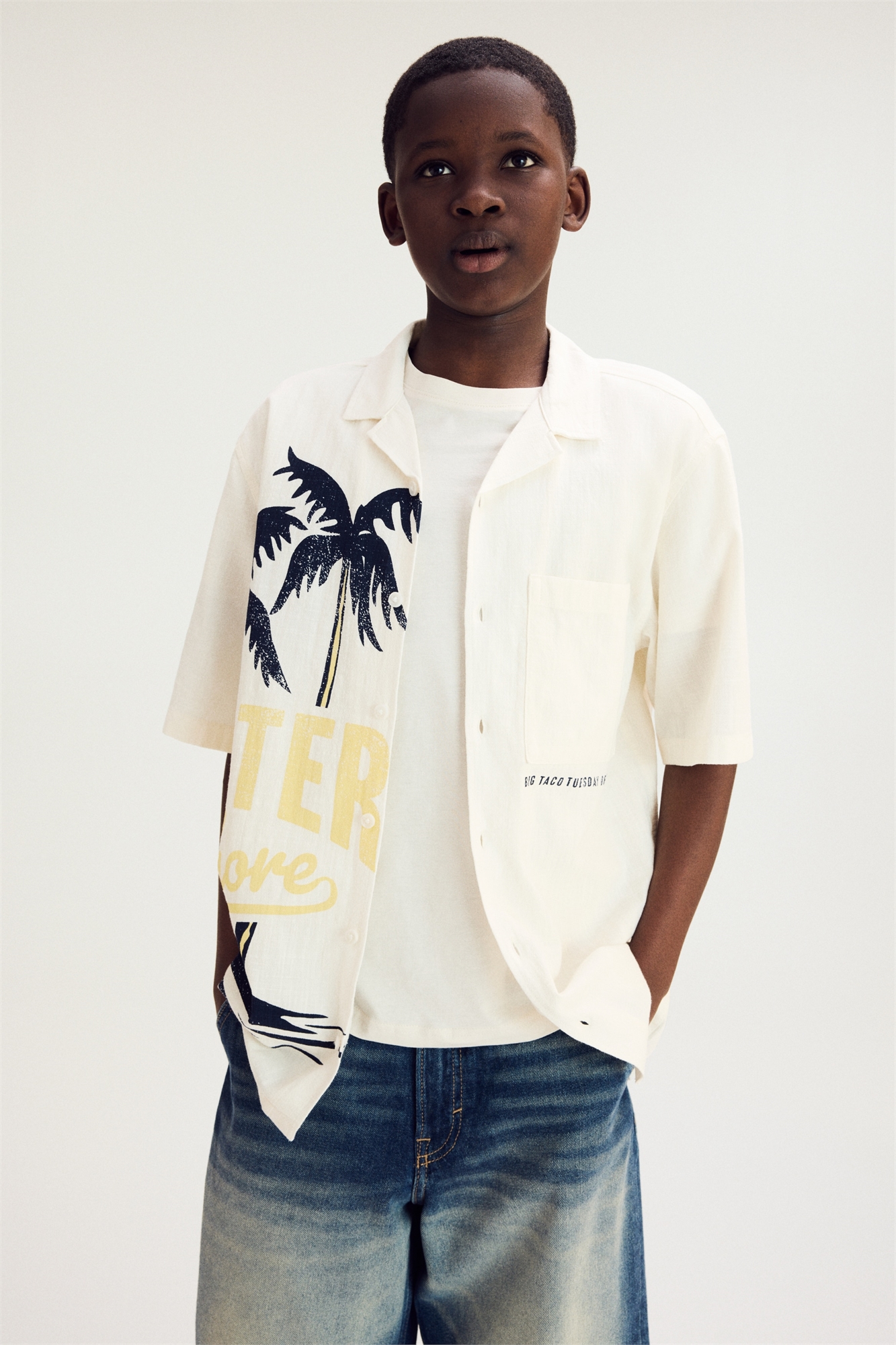 Рубашка с короткими рукавами из фактурного хлопка с набивным рисунком, курортным воротником, пуговицами спереди и накладным нагрудным карманом.