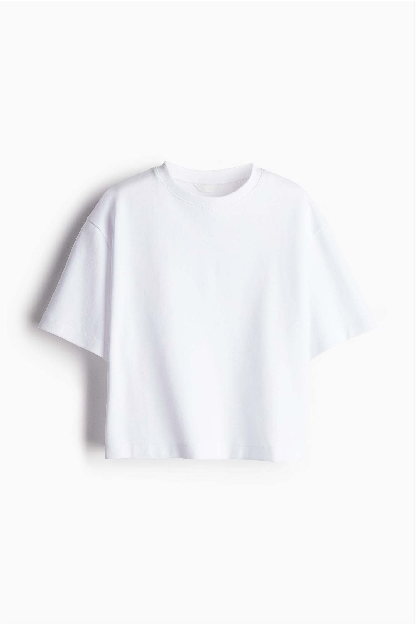 Футболка в стиле бокси из плотного интерлока, сшитого из смеси хлопка. Горловина, слегка спущенные плечи и прямой подол.