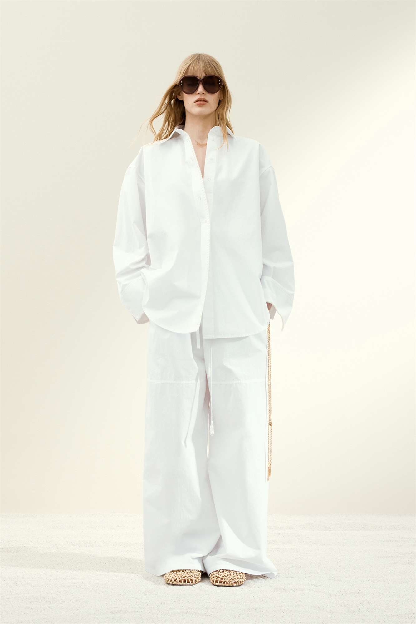 Коллекция Studio. Классическая рубашка из хрустящего хлопкового полотна с воротником, застежкой на пуговицы спереди и ярмом с глубокими складками сзади для создания слегка сутулого силуэта. Длинные рукава с вырезом подмышкой, манжеты на пуговицах и рукавная планка с пуговицей. Свободный крой с мягко опущенными плечами и слегка направленными вперед плечевыми швами. Тонкая отстрочка по пуговицам и манжетам. Закругленный подол. Удлиненный сзади.