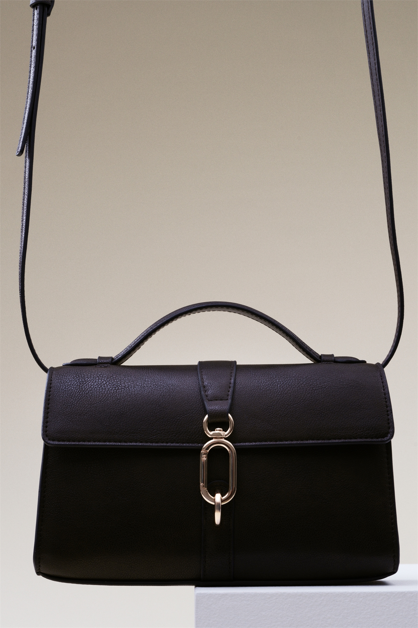 Сумка-кроссбоди с мягкой ворсистой отделкой, ручкой и регулируемым плечевым ремнем с металлической пряжкой. Откидная крышка с овальным крючком-карабином спереди. На подкладке. Глубина 5 см. Высота 15 см. Ширина 22 см.