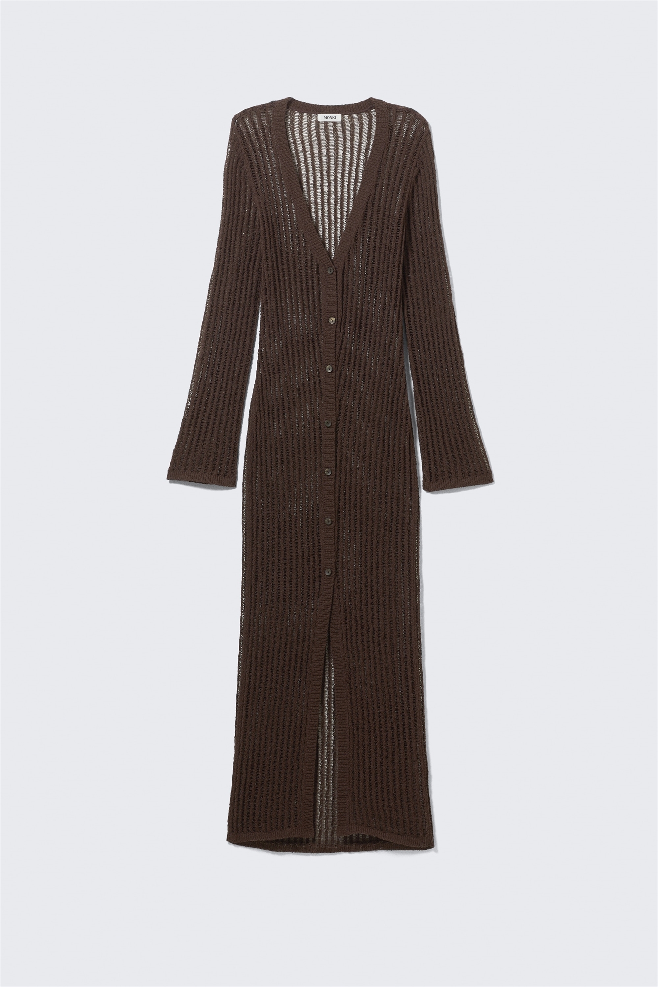 Длинный трикотажный кардиган с воздушной ажурной фактурой, с глубоким V-образным вырезом и застежкой на пуговицы спереди. Длинные рукава и ребристая отделка. Обычный крой. Длина макси. Глубокий V-образный вырез. Застежка на пуговицы спереди. Фактура ажурной вязки. Ребристые манжеты и подол.