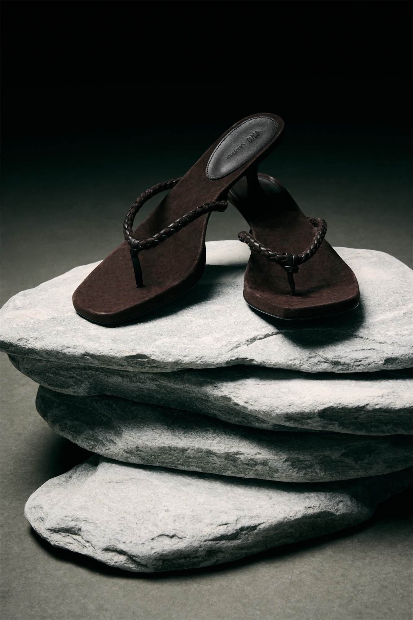 Сандалии на каблуке из мягкой замши и кожи с угловатыми носками, плетеным ремешком и узким мыском.