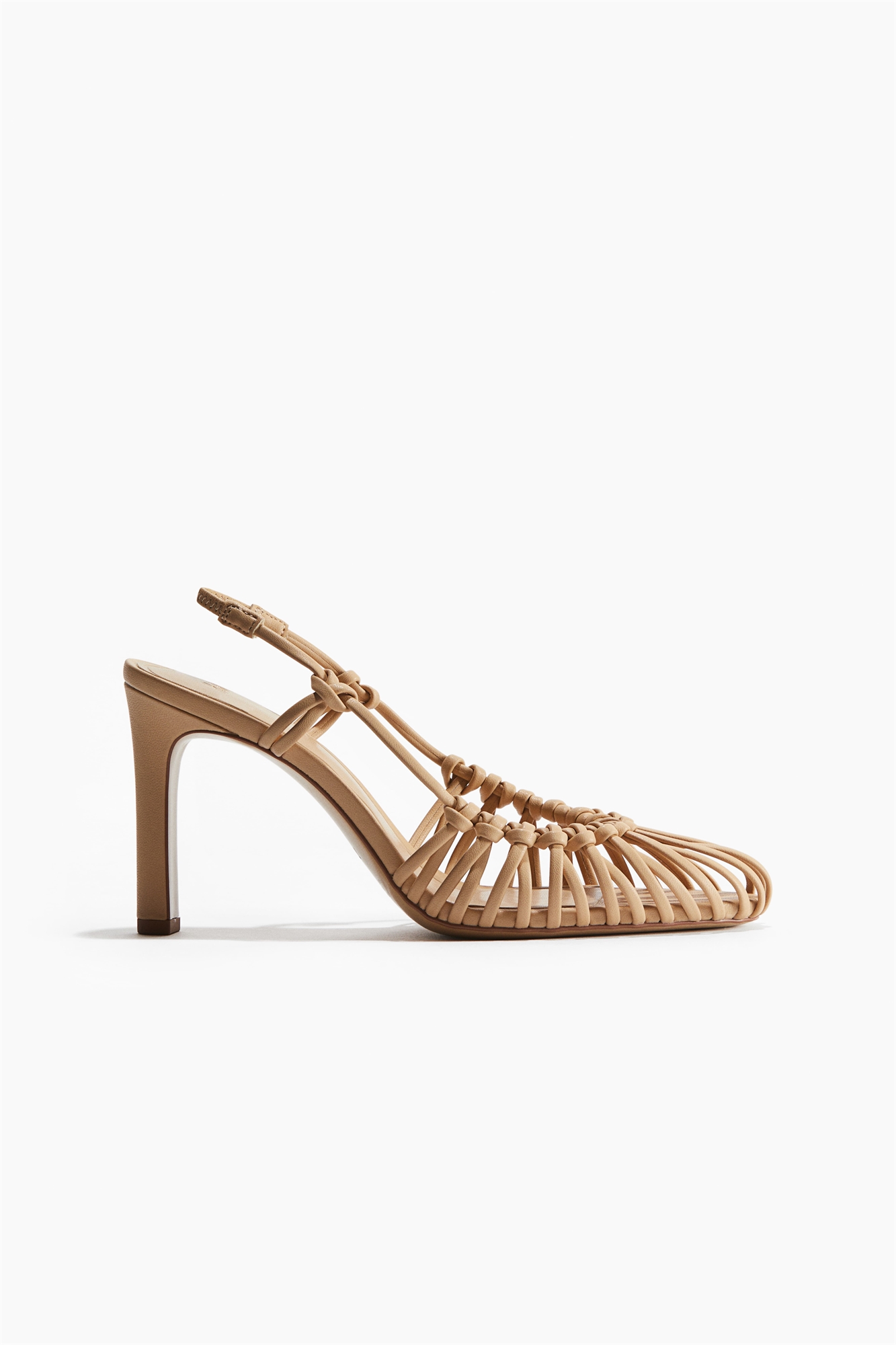 Сандалии на каблуке из лакированной ткани с закругленными мысками, закрытыми узкими ремешками, завязанными узлом. Узкий эластичный ремешок на пятке сзади.