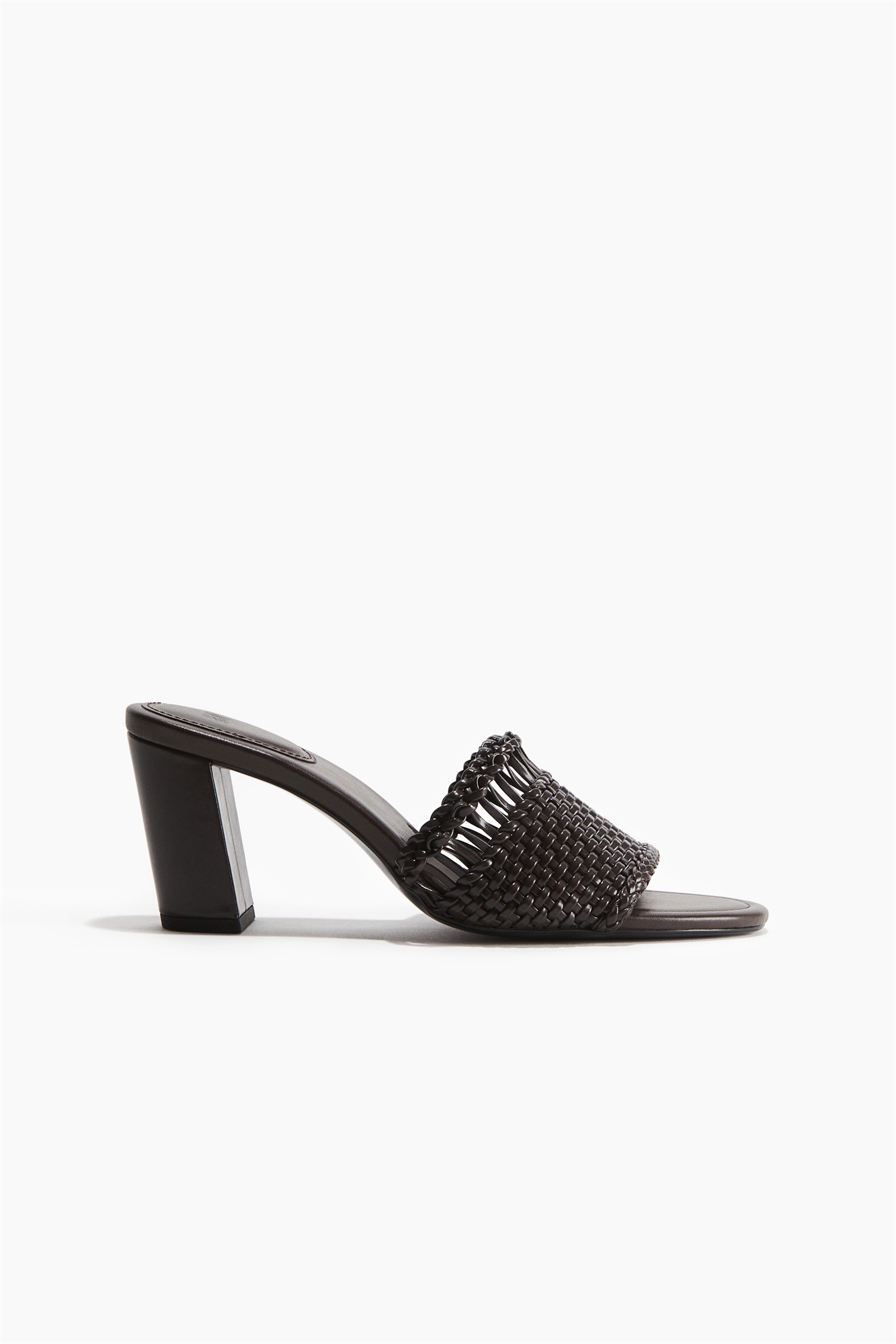 Сандалии на каблуке из мелованной ткани с закругленными носками, широким плетеным ремешком и закрытым каблуком.