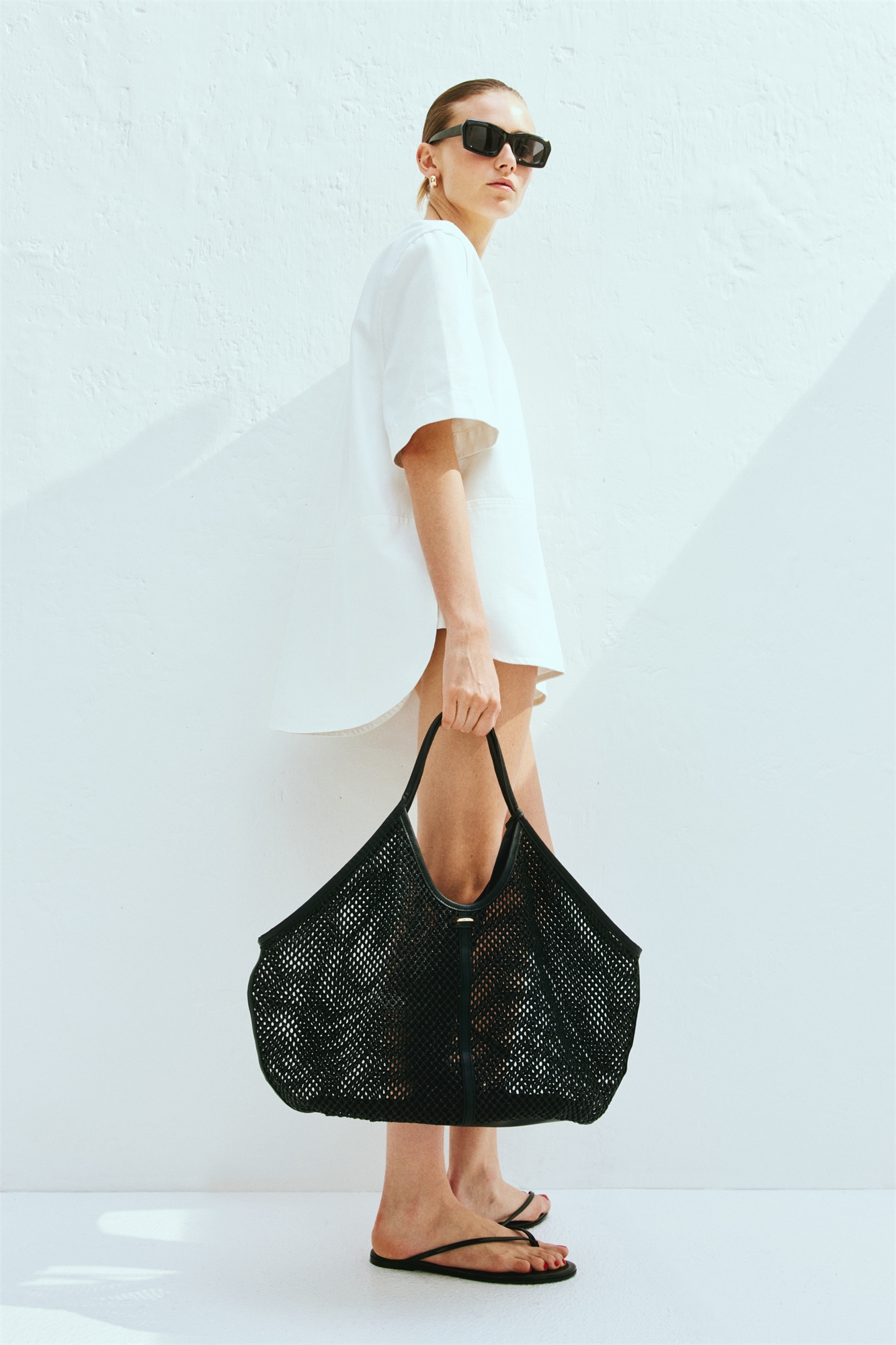 Сумка-шоппер из сетки с деталями из лакированной ткани. Узкие ручки и узкий ремешок с металлической петлей вверху. Карман на молнии, прикрепленный к одной из ручек. Без подкладки.