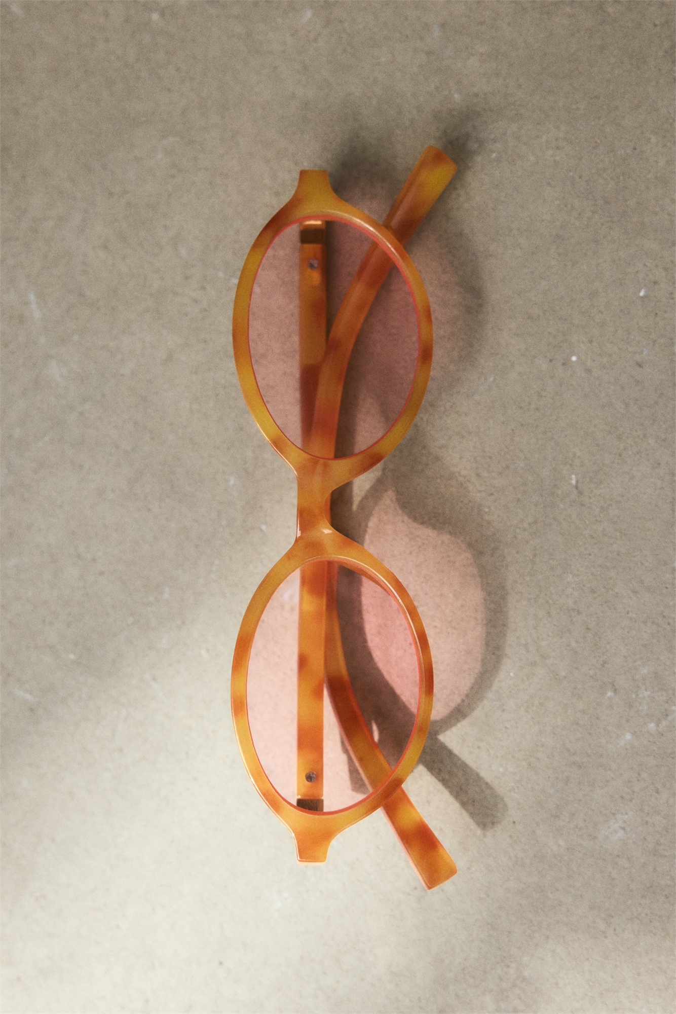 Овальные солнцезащитные очки с пластиковой оправой и боковыми дужками. Тонированные пластиковые линзы с УФ-защитой.