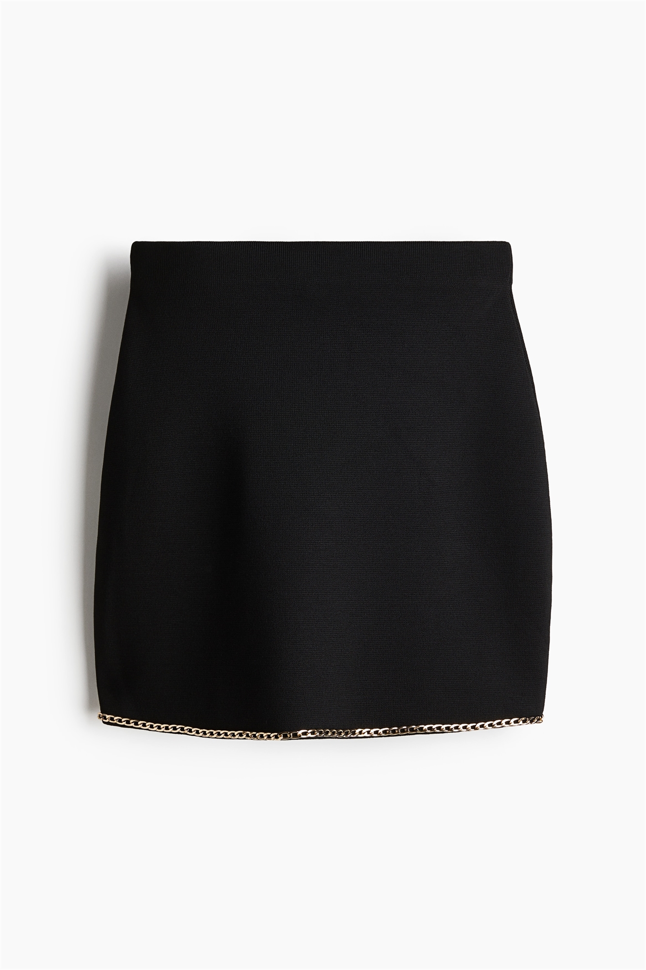 Короткая приталенная юбка из плотного трикотажа с высокой эластичной талией и декоративной металлической цепочкой по подолу.