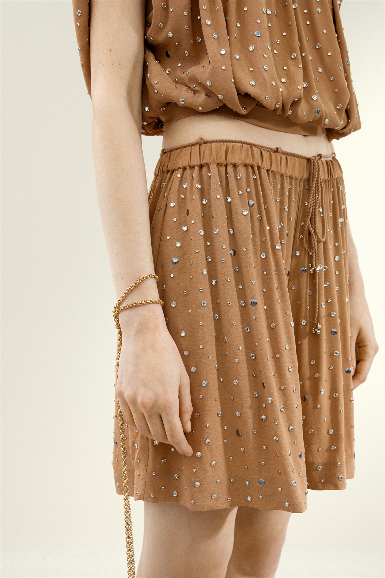Studio Collection. Свободные шорты длиной до колена из вискозного крепдешина, украшенные блестящими шипами и стразами. Эластичная талия с удлиненными петлями для ремня с веревочной завязкой, которая располагается над шортами в качестве стильного пояса с металлическими бусинами на концах. Незаметные боковые карманы.