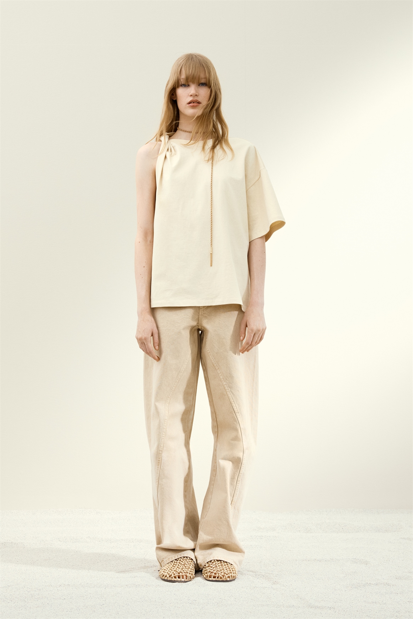 Studio Collection. Футболка в стиле бокси из плотного хлопкового джерси свободного кроя. Асимметричный силуэт с опущенным плечевым швом и коротким рукавом с одной стороны и перекрученной лямкой с другой - для современного образа.