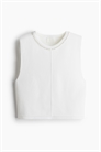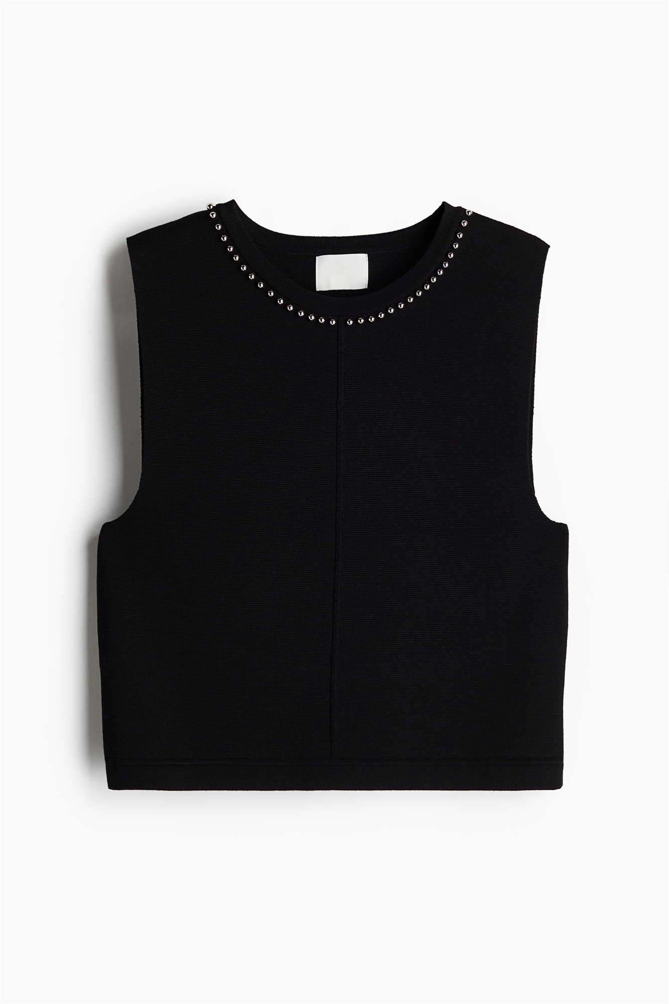 Короткий приталенный жилет-топ из плотного трикотажа с круглым вырезом, украшенным блестящими бусинами.