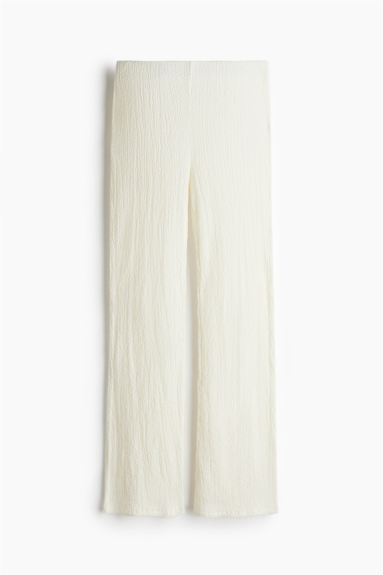 Облегающие брюки из фактурного трикотажа с высокой эластичной талией и расклешенными штанинами.