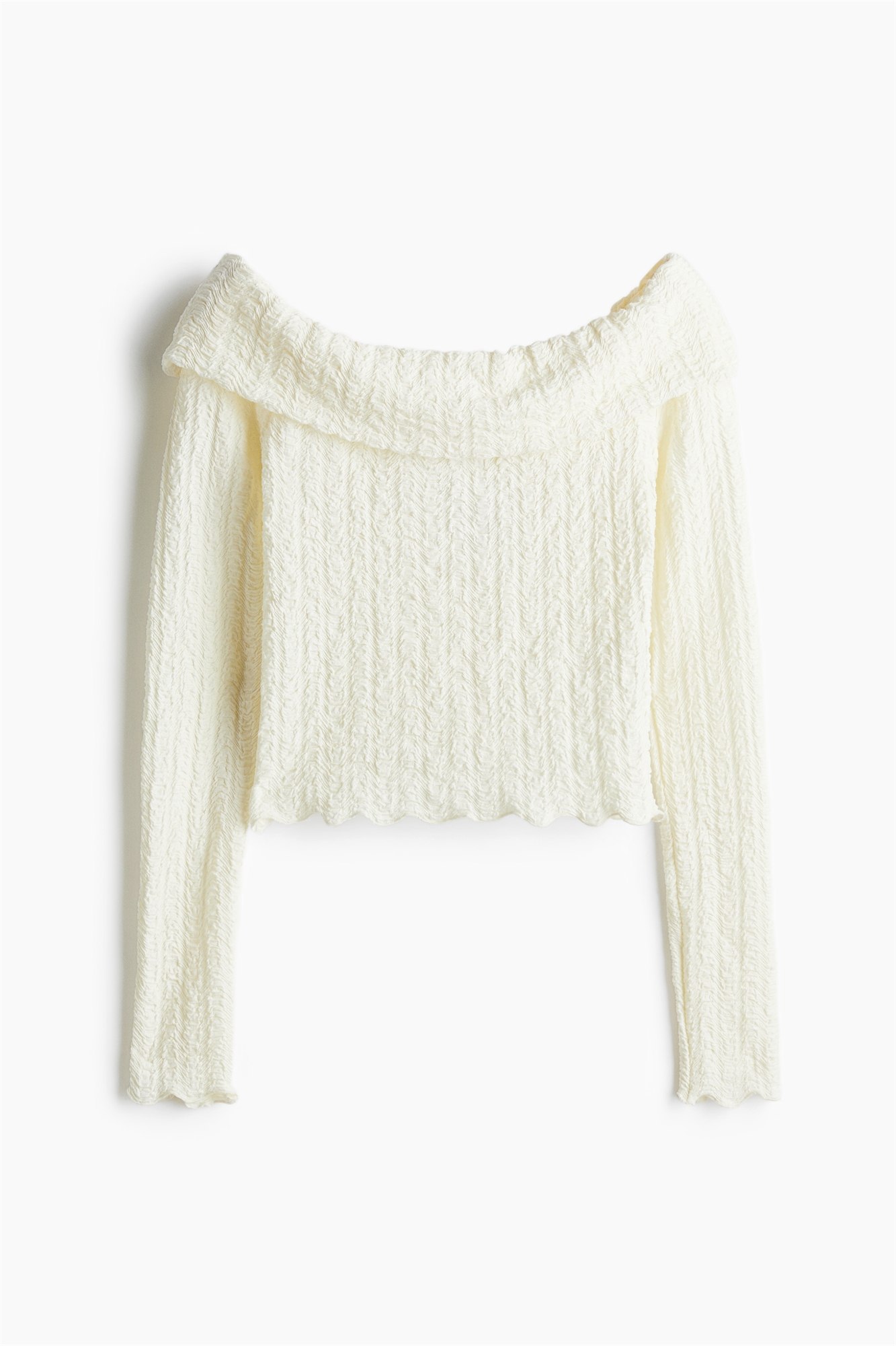Облегающий топ без плеч из фактурного джерси с откидным верхним краем и длинными рукавами. Манжеты и подол обработаны оверлоком.
