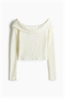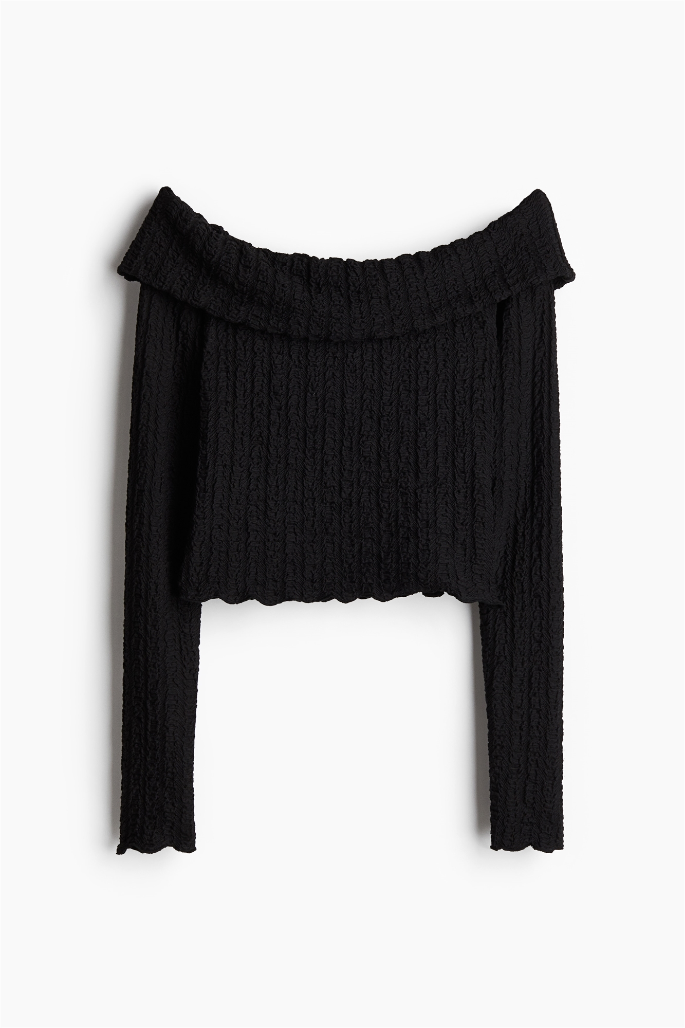 Облегающий топ без плеч из фактурного джерси с откидным верхним краем и длинными рукавами. Манжеты и подол обработаны оверлоком.